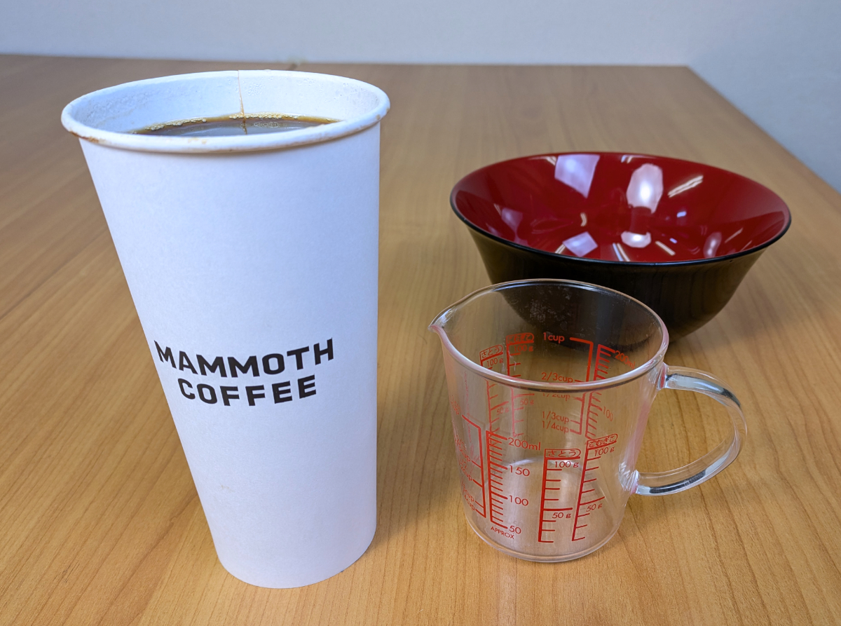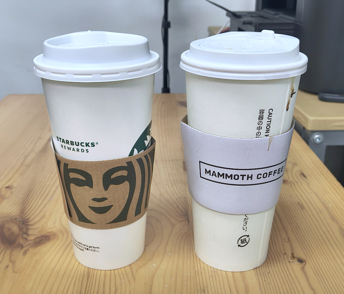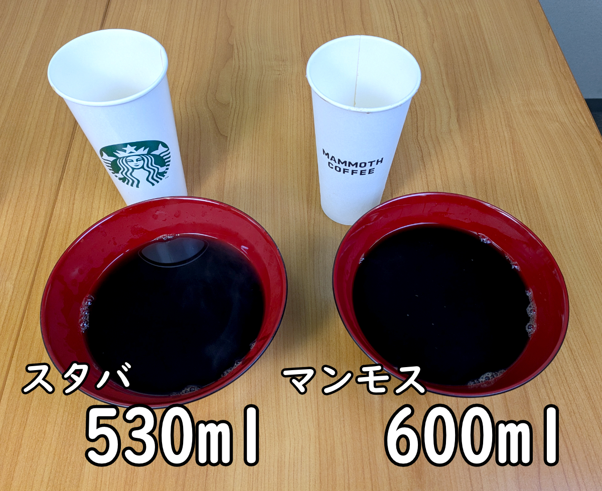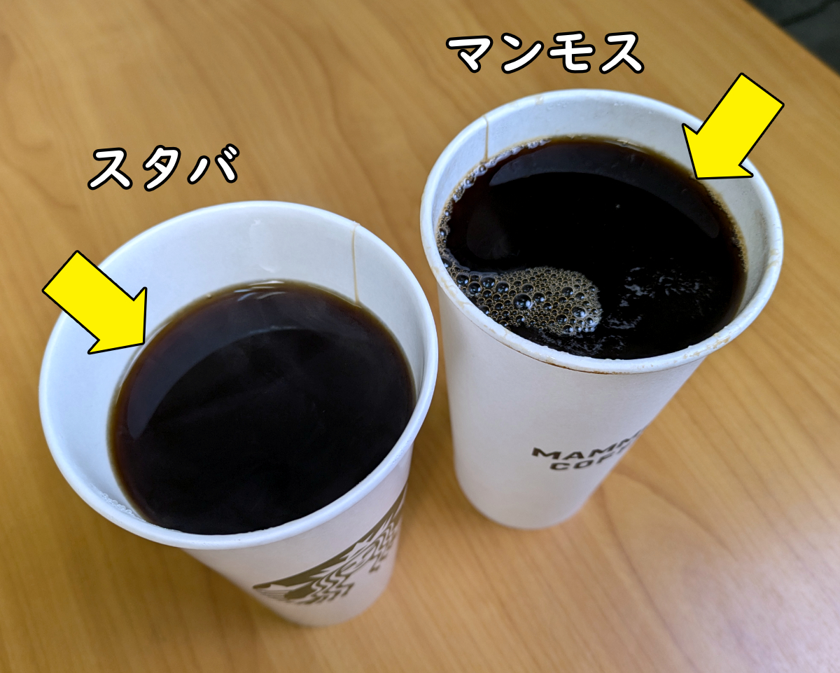 ここのドリンクは、一般的なコーヒーチェーンと比べて量が多くしかも安い。どれだけ多いのかをたしかめるために、スタバで最大サイズの「ベンティ」と、マンモスのLサイズを比べようとしたところ、同一サイズのカップを使用していることがわかった。