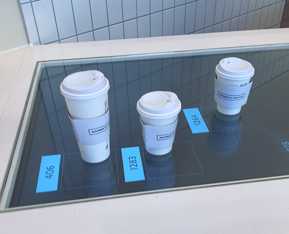 そしてアメリカーノを注文して待っていると、私の番号を呼ばれた! カウンターをよく見ると……。この机、ディスプレイじゃないか! これすごい、ディスプレイに番号が表示されているから、取り違える心配がない。しかもスタッフの手間を省いている。よくできた仕組みだなあ。