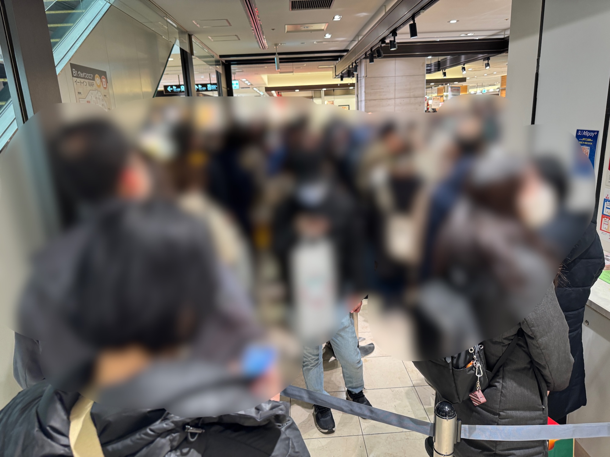 しかしマフラーのレジ行列により、すでに開店から45分を消費している。人気の福袋がまだ残っているとすれば、地下の食品売り場しかないだろう。そう思い、急いで地下へ向かったところ……長すぎてゴールが見えない行列を発見んァァァアアア!!!!!