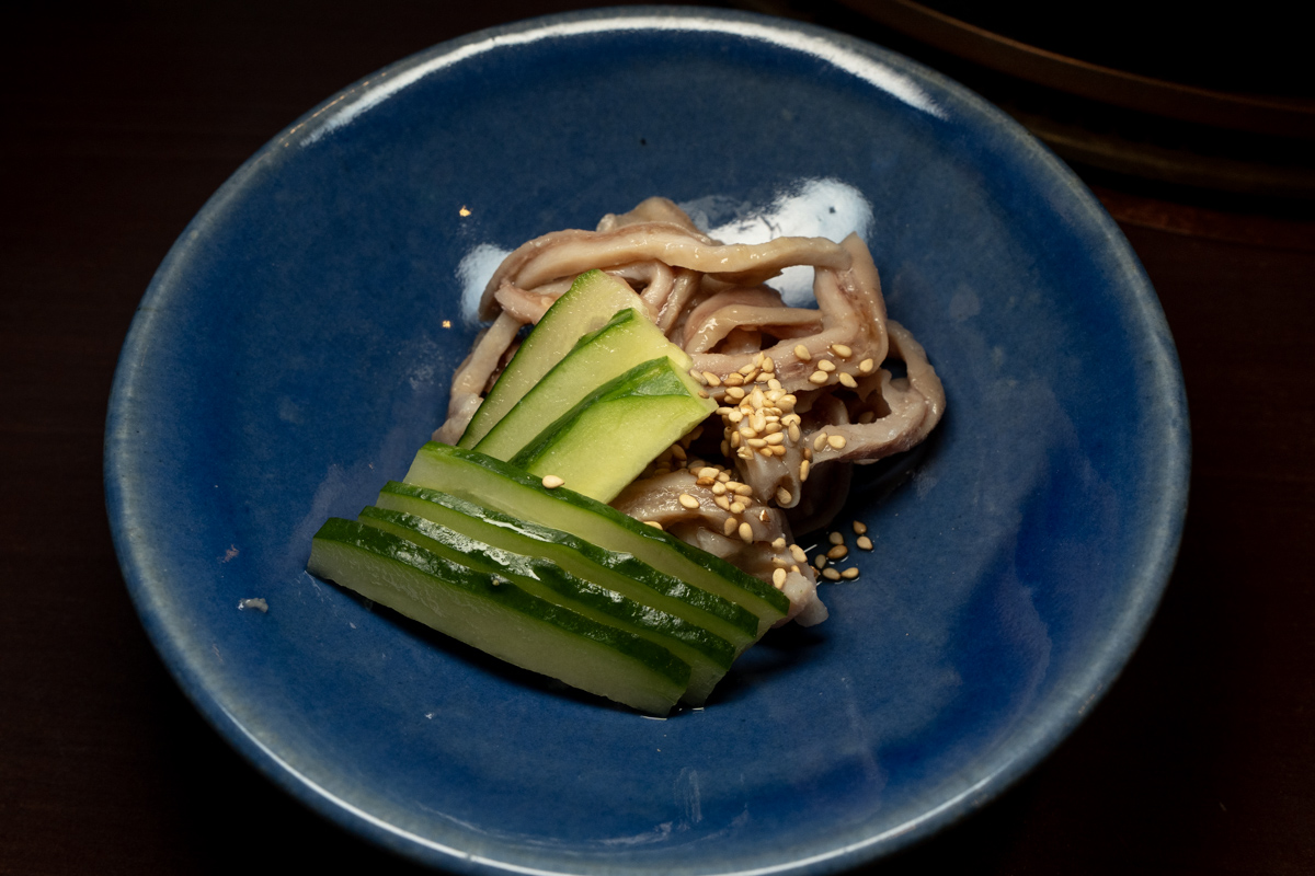 「コリコリもつポン(649円)」。トロプリでカラウマな明太鍋。アツアツでピリ辛だが、卵ゆえのマイルド感がある「明太たまご焼き」。その両方と温度、食感、味わいの全てが完全に異なるこいつは、名脇役となる。3つ全部頼んで順番に食うと、素晴らしいハーモニーを味わえる。