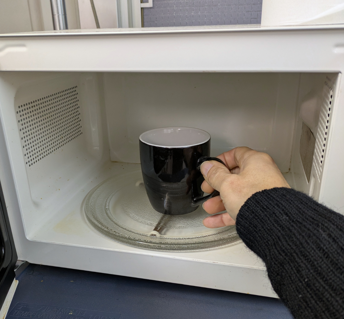 冷たい状態でも辛味を感じるということは、温めるともっと辛く感じるかも? ってことでマグカップに移し替えて約1分レンチンすることに。なお、電子レンジで温める場合は、別容器に移し替えることを推奨している。