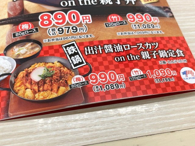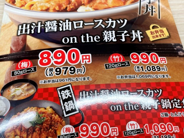 2026年1月16日より販売が始まった『出汁醤油カツ on the 親子丼』。丼と定食の2種類があるのはいつも通りだが、本作はさらにロースカツが80gの「梅」と120gの「竹」にルートが分岐する。