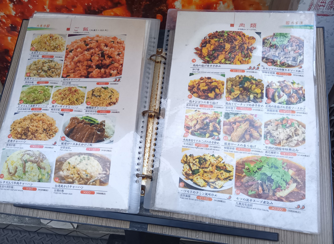 それは『九寨溝(きゅうさいこう)』というガチ中華の店。オープンは11時30分のようで現在11時15分なので、オープン待ちの行列だ。ただ、店外に掲出されたメニュー表を見てもオープン前から並ぶような店とは思えない。五目炒飯が税込935円と価格帯も普通。