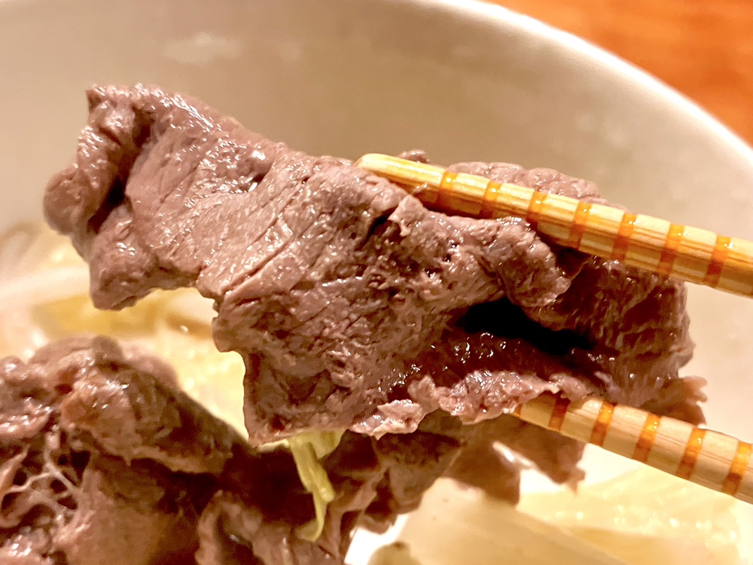 そして牛肉がおいしい~~~!!!! 1枚あたりのサイズが大きいだけでも満足感が高いのに、噛めば噛むほど旨みがしみ出してくる。