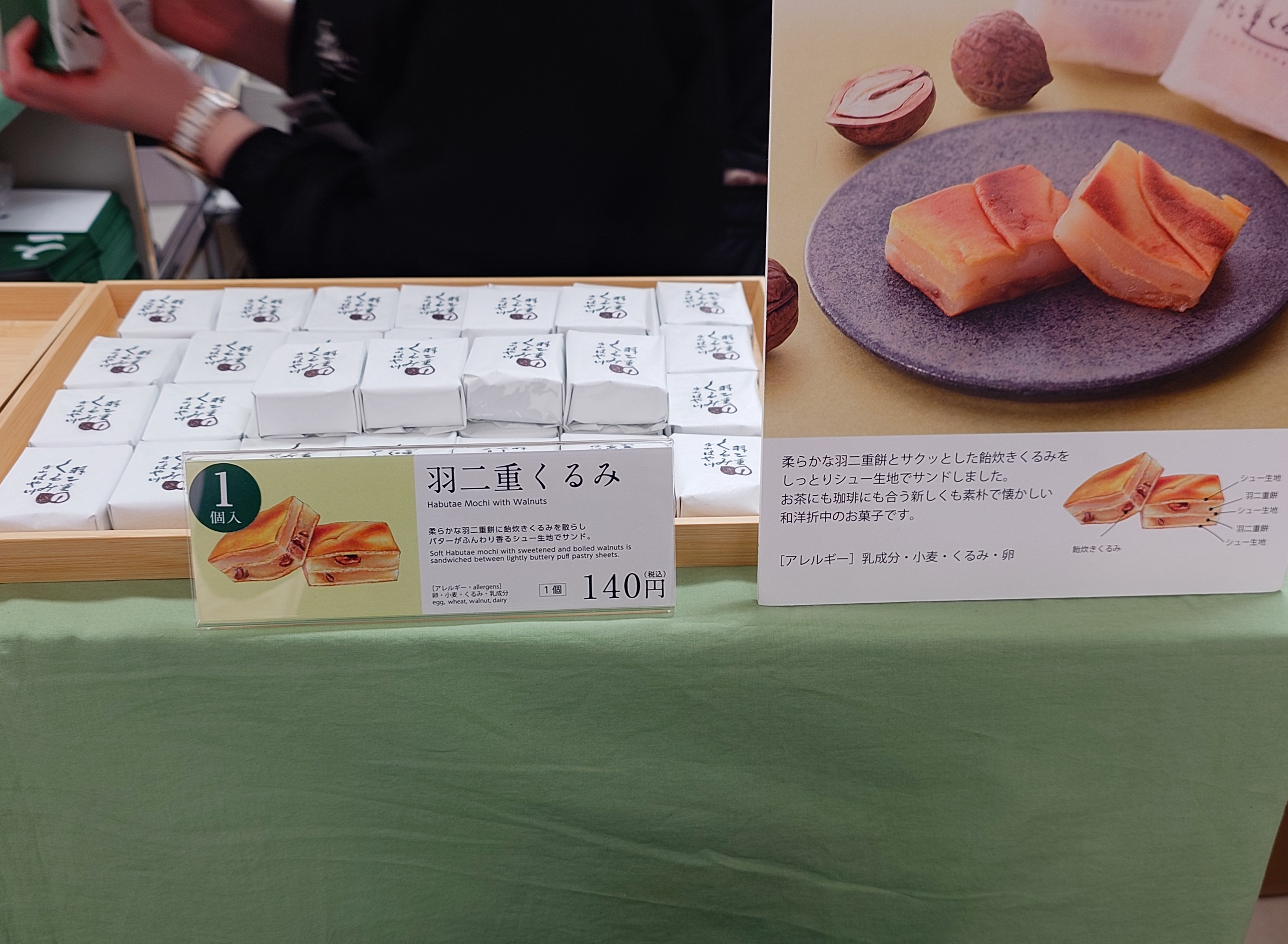 話は変わるが、耳寄り情報を。催事場には、私が貰った土産史上最大の衝撃を受けた はや川の「羽二重くるみ」も来ている。単品から買える。1個140円。