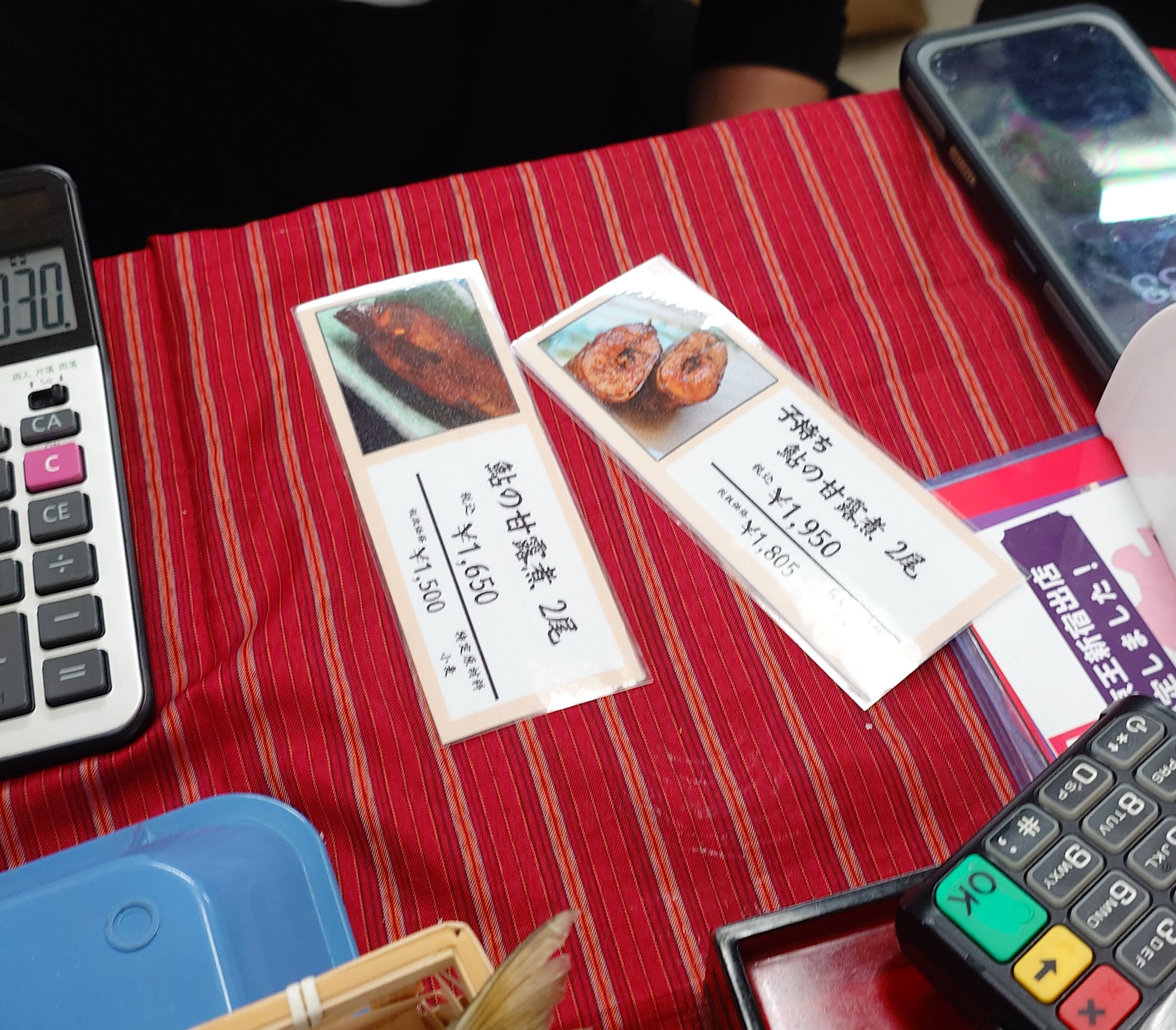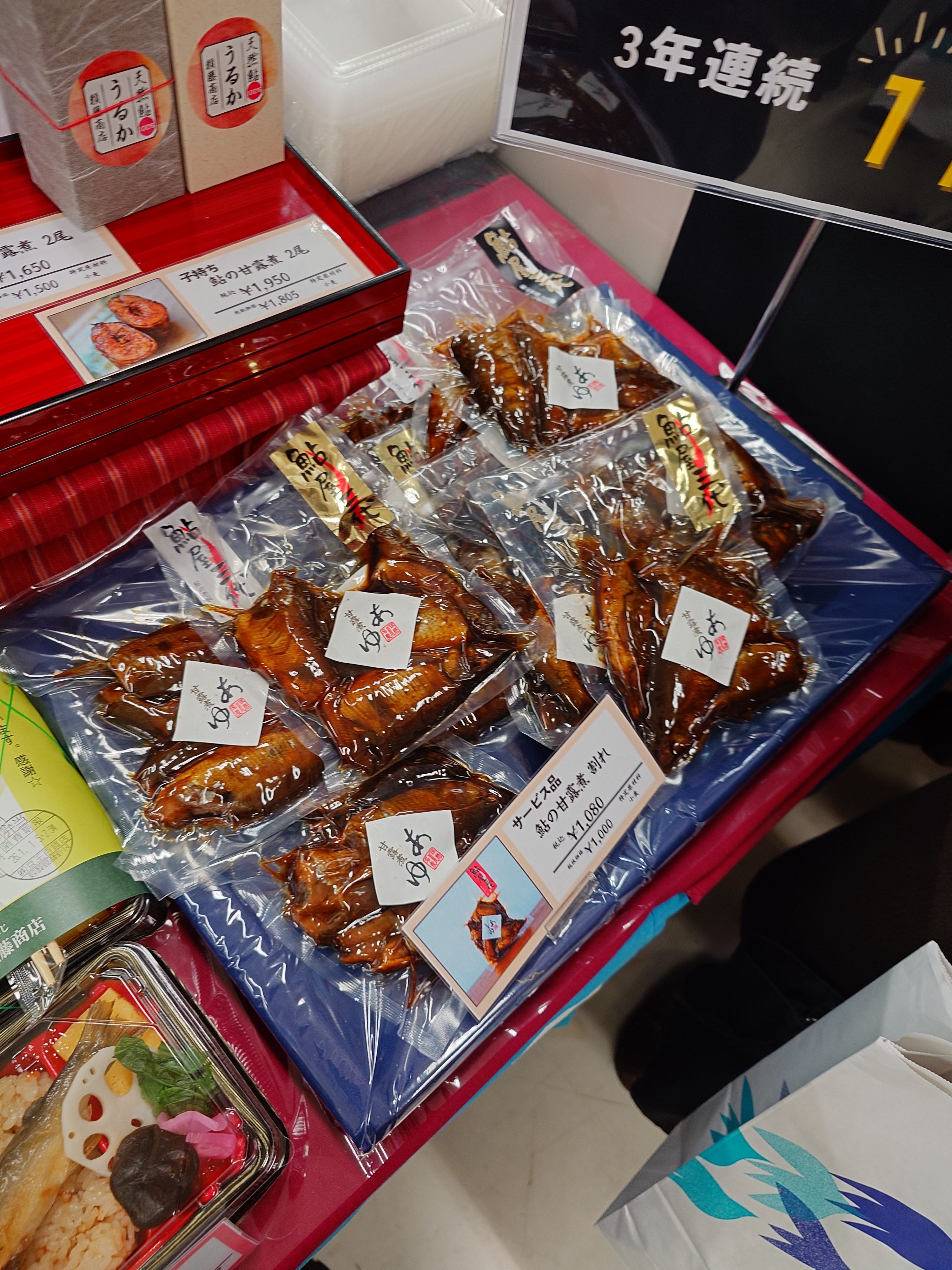 ▼ブースではサービス品の「鮎の甘露煮 割れ」が1080円で売られている。これはここだけのものだそう。