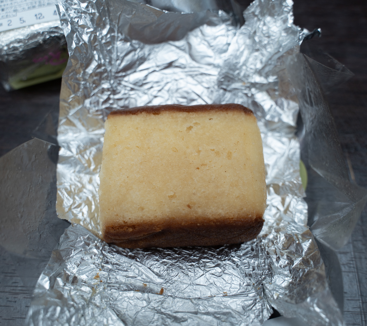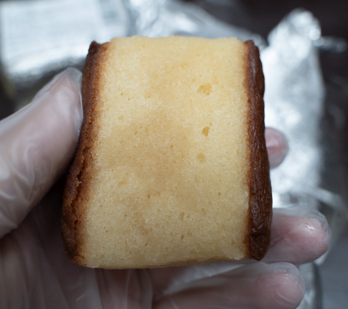 中に入っていたのは……だいぶ重く、湿ったカステラ。なるほど……。ラム酒入りというから香りづけ程度かと思ったが、そうではないことが察せられる。