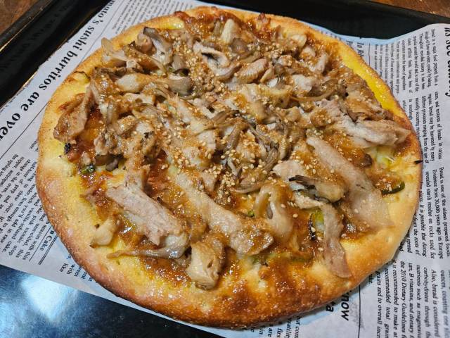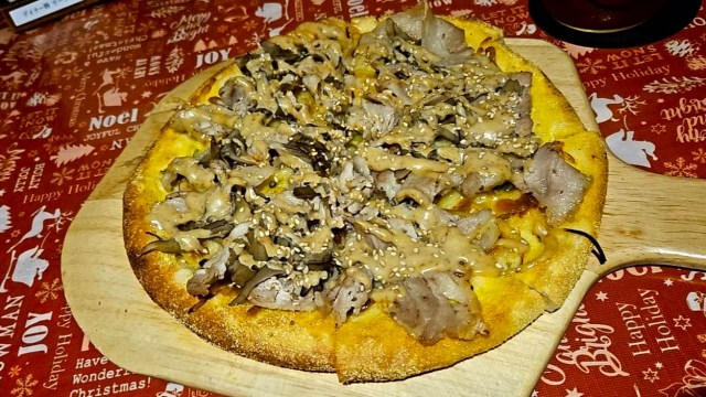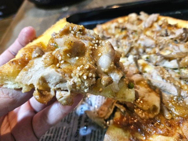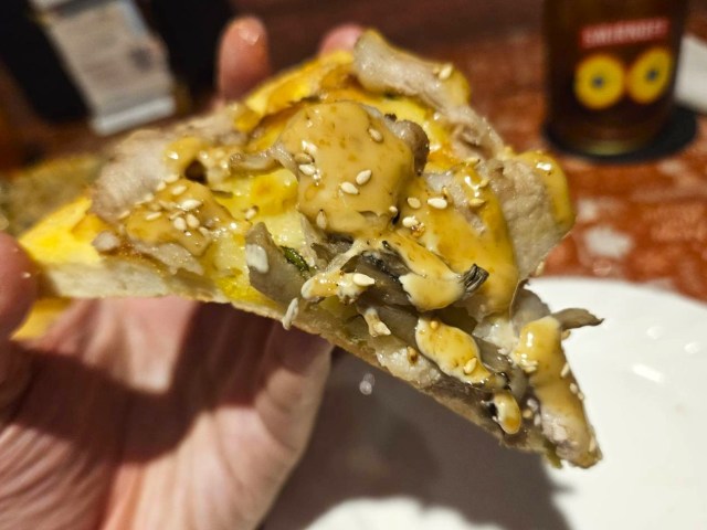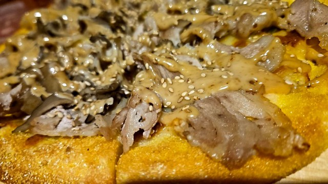 ごましゃぶをピザの上にトッピングしてしまうという大胆な発想。これを思いついた人はマジの天才! 表彰したいレベル。もうホントそれくらい美味い。