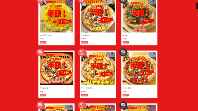 メニューを開くと、TWO WAY PIZZAの商品がずらりとラインナップ。