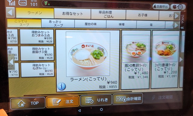 初めてではあったが、同店を代表するメニュー、「こってりラーメン」を迅速かつ真っ先に選んだ。不慣れな端末でも着席からここまでわずか数秒である。何はなくとも「こってり」なのである。