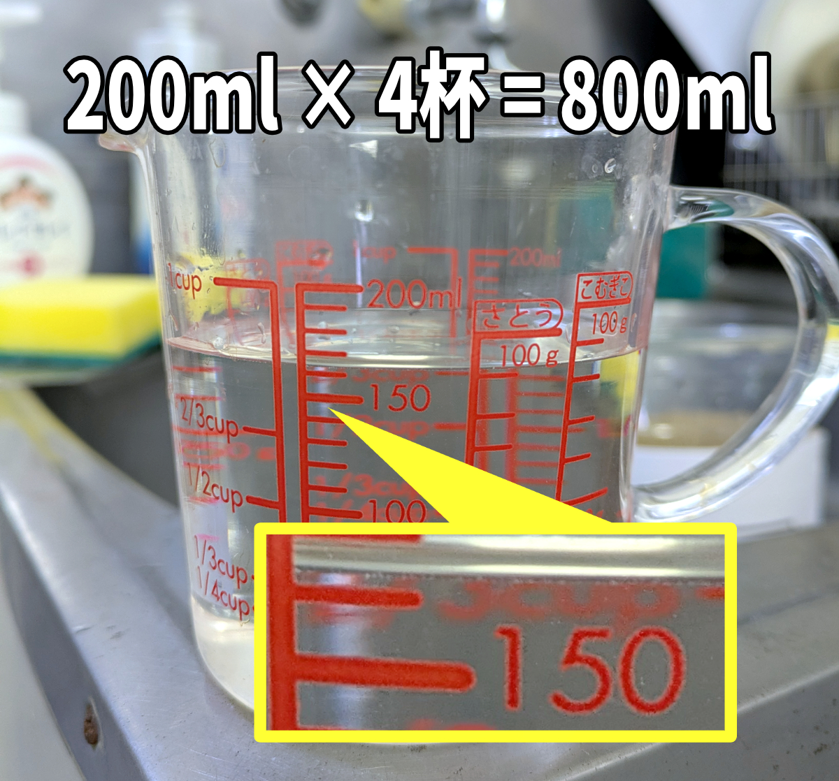 今一度カップを空にして水で満たし、計量カップで200mlずつ区切って計測したところ……。