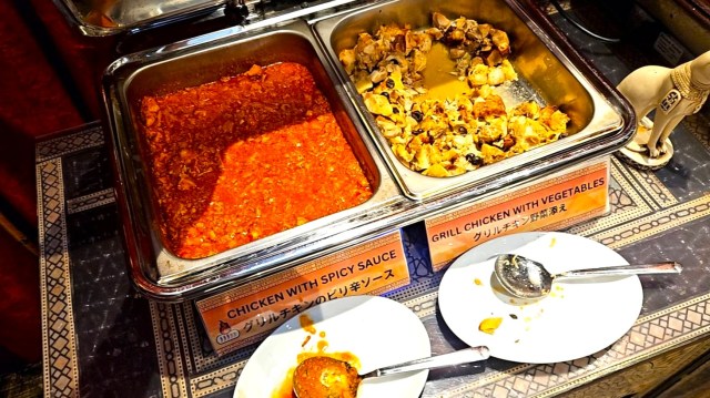グリルチキンが2種。味はピリ辛ソース味&野菜添えの塩味。