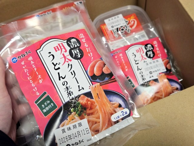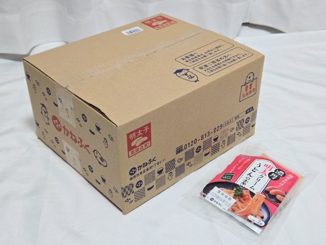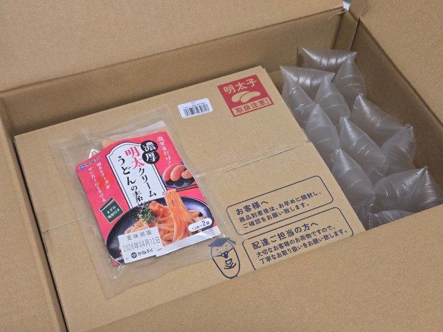 納品書を見るに、「濃厚明太クリームうどんの素」はオマケみたいだな。オマケのためだけに、わざわざもう一回り大きいダンボールに入れてくれる「かねふく」の優しさに胸打たれたぞ……!