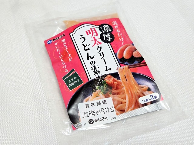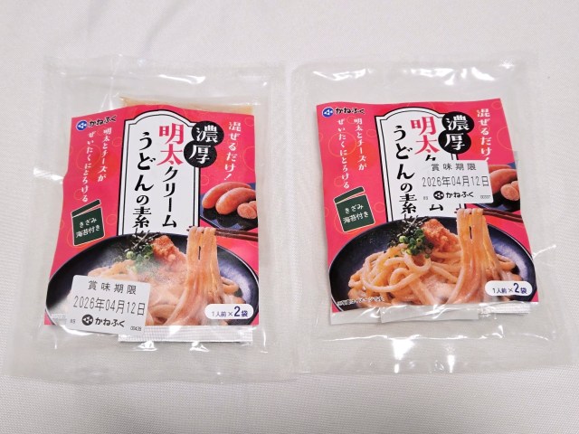 そして、オマケも含めてなぜか2つ入っていた「濃厚明太クリームうどんの素」も見てみるか。調べてみたところ、比較的最近発売された新商品みたい。1袋で2人前なので、各袋にソースと刻み海苔が2個ずつ入っている。