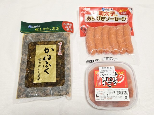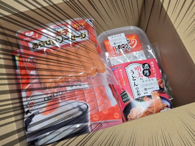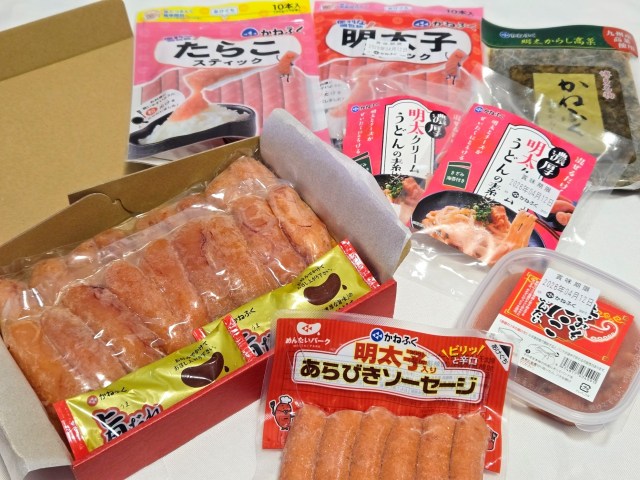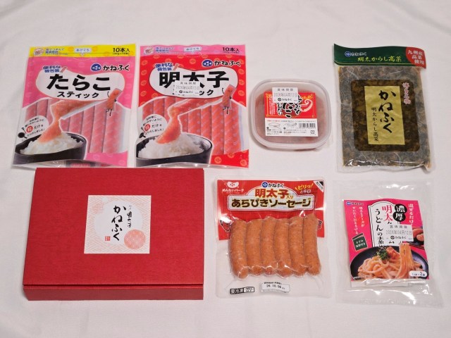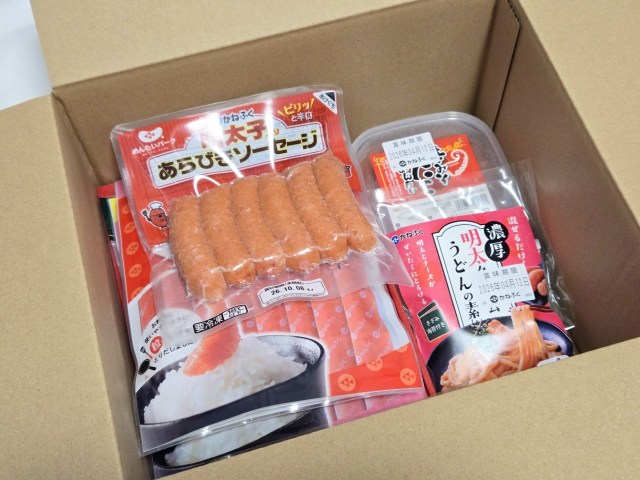 とりあえず全ての商品を確認してみよう。事前情報の通り、1kg越えの明太子が1箱と、その他の明太子商品が6品入っていた。