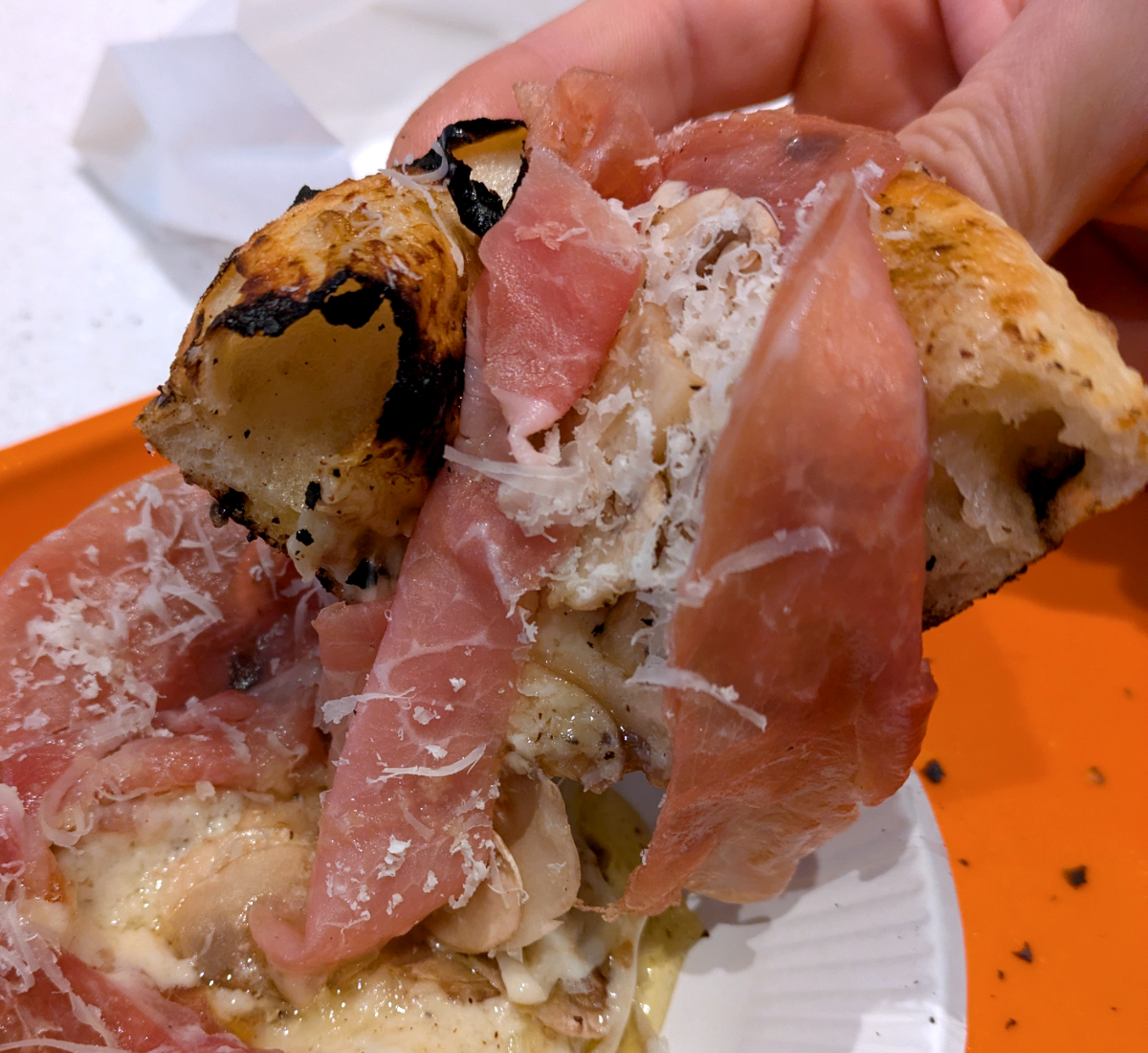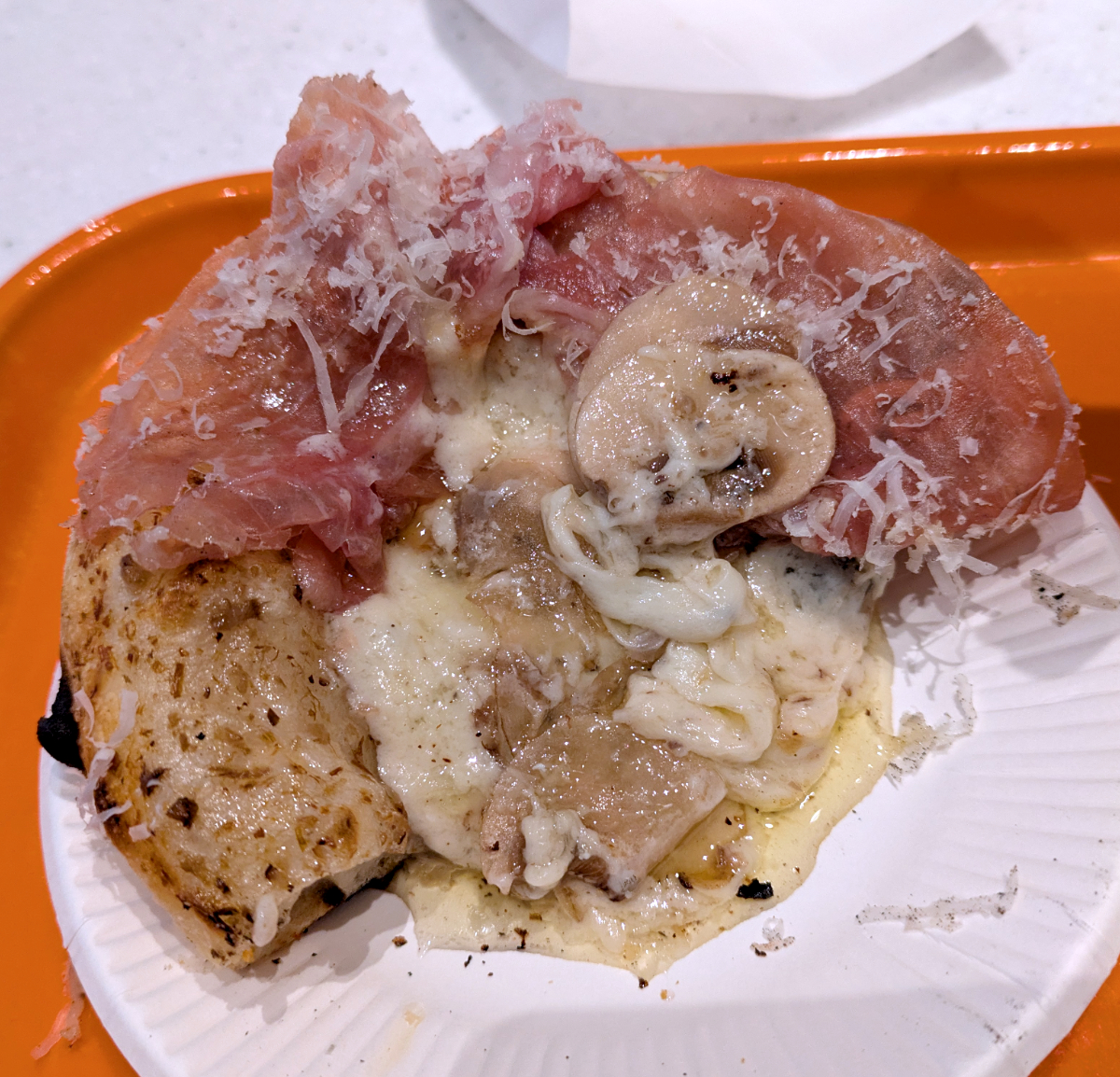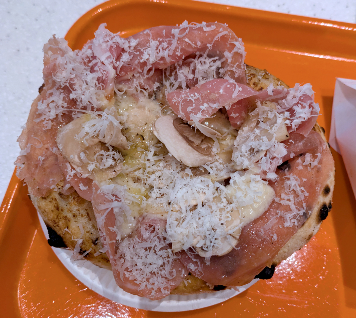 ピザなのだが、生ハム・キノコ・チーズなどの具材が生地を覆いつくしている。見た目のインパクトは強いんだけど、サイズがなあ~……。ワンハンドサイズっていうけど、ピザというよりもパンのような大きさ。