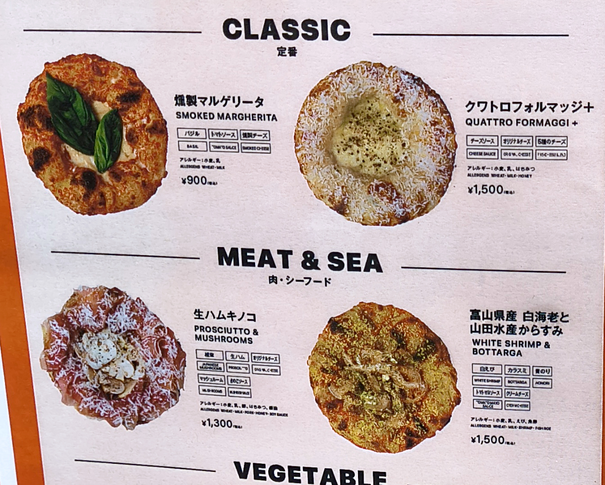 え~と、「燻製マルゲリータ」が税込900円、「クワトロフォルマッジ+」が税込1500円。「生ハムキノコ」が税込1300円で、「富山県産白海老と山田水産からすみ」が税込1500円か~。