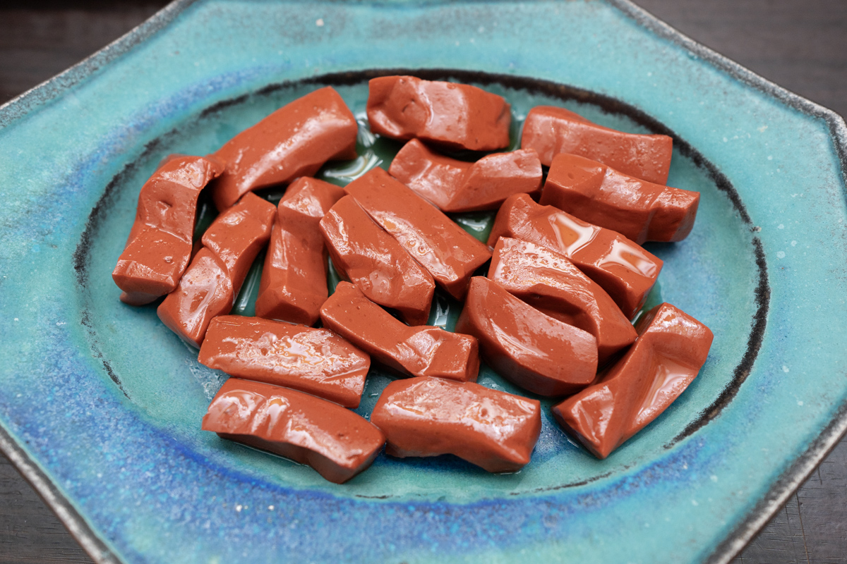 人気2位は伊達ではない。三二酸化鉄で染められたこんにゃく。派手な朱色でレバーのようだが、味はソフトめなこんにゃくという感じ。