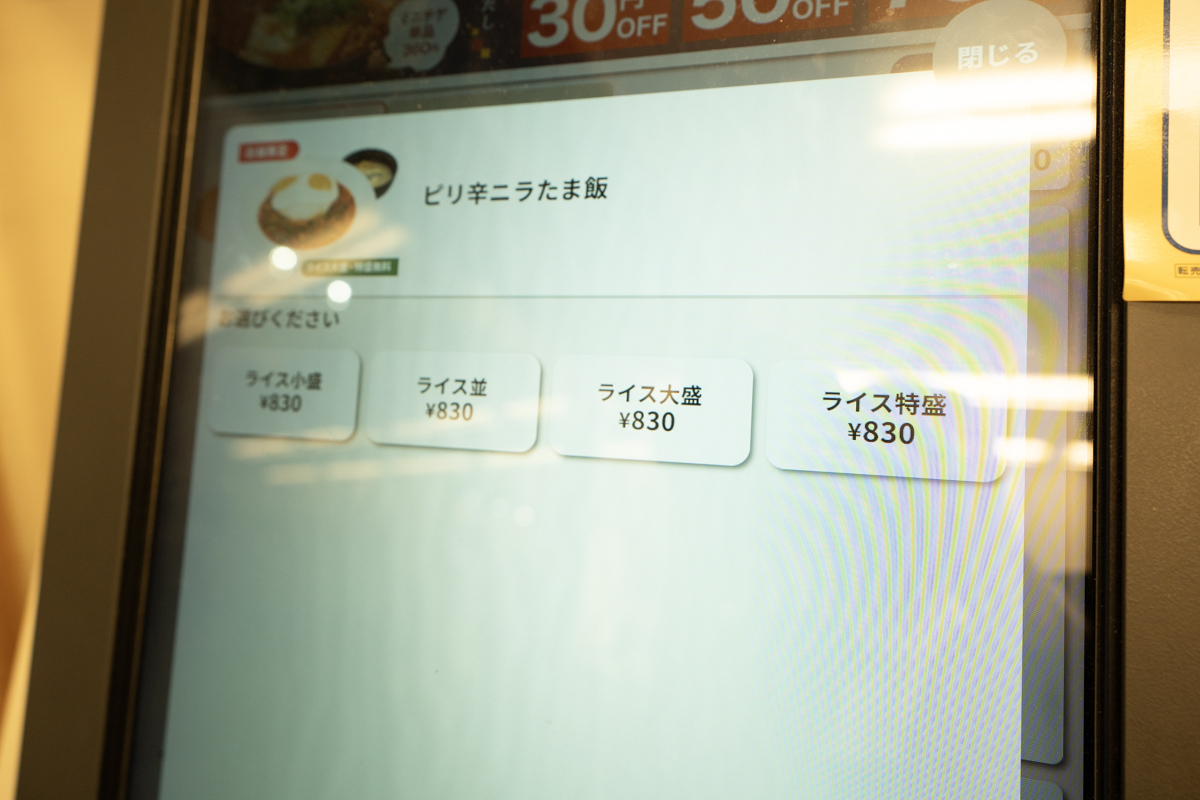 価格は830円。店舗限定メニュー恒例の、ライスの量に左右されない一律の価格設定だ。