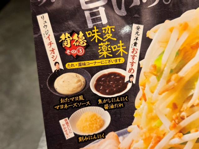 『背徳 至高のグルメフェア』では、にんにく香る「濃厚豚スープだし」が新登場し、味変薬味が3種と、〆にオススメだという「ワシワシ麺」なるものが追加されている。