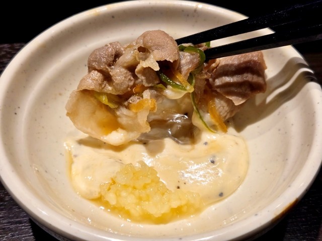 ▼安元さんオススメの「焦がしニンニク醤油だれ」も試してレビューしたかったけど、食べてみたらまさかの「麻辣醤(マーラージャン)だれ」でした。提供初日だったからこういうハプニングも致し方なし。