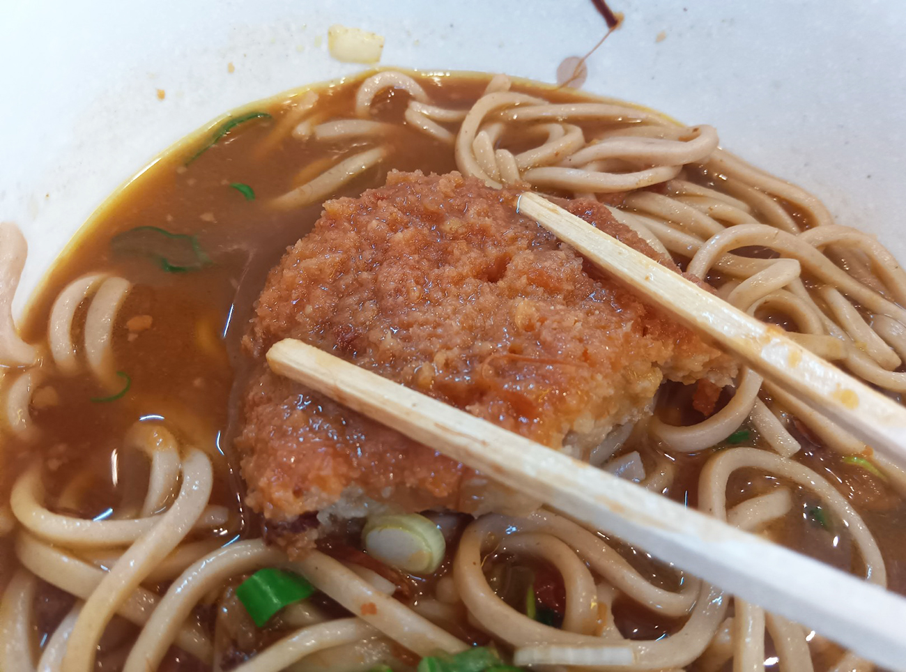 ポテトコロッケ版のコロッケそばの発祥は定かではないが、少なくとも駅そばチェーン「箱根そば」が昭和40年代に販売し始めたことは知られている。意外と歴史が長いのだが、今もたまにアリかナシかの議論を見かけるので、これは現在進行形の邪道そばと言えるのではないだろうか。