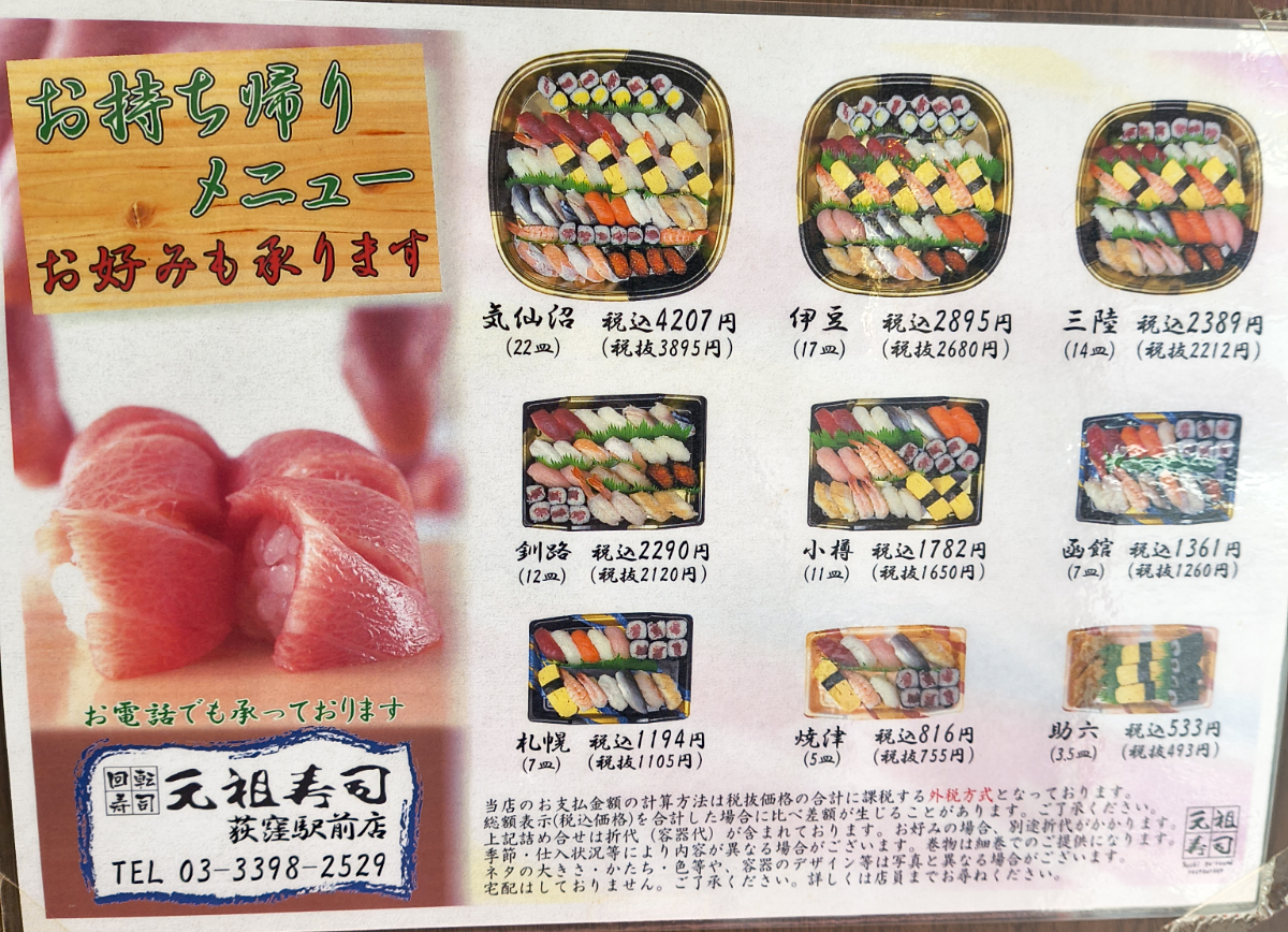 JR中野駅周辺在住の私は、何かの拍子で「元祖寿司荻窪駅前店は美味い」との情報をキャッチした。ローカルな情報なので、SNSか何かのおすすめで上がってきたらしい。詳しい出所がどこだったのか、忘れてしまった。