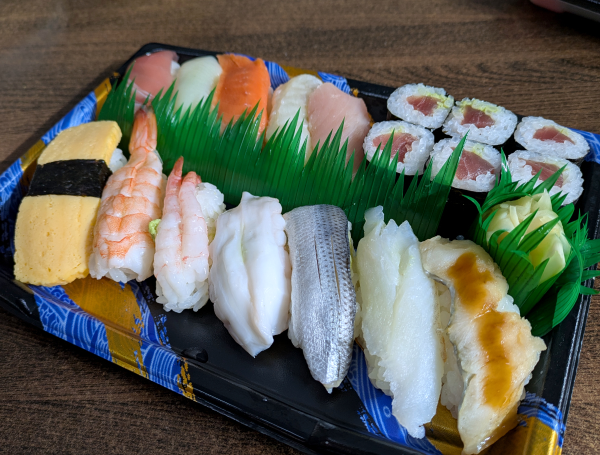 持ち帰りメニューに手頃なものがあったので、それを注文したところ、開店直後であったために30分ほどかかるとのことだった。その辺で時間を潰して無事に購入。味を比較するために、近くのスシローで同じくらいの寿司を購入して帰った。