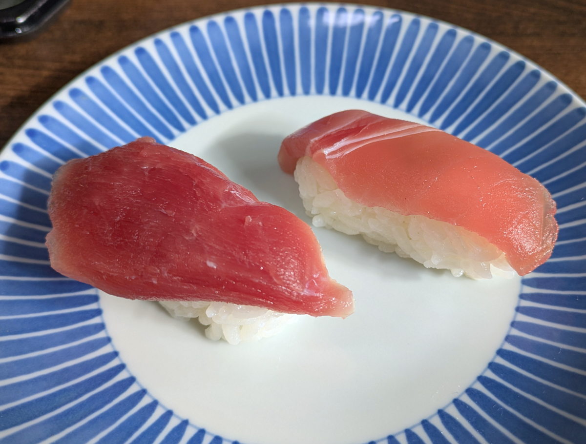 まずはマグロを見比べてみると、スシローはマグロに限らずネタが大きく見える。それに比べて元祖はネタもシャリも小ぶりだ。