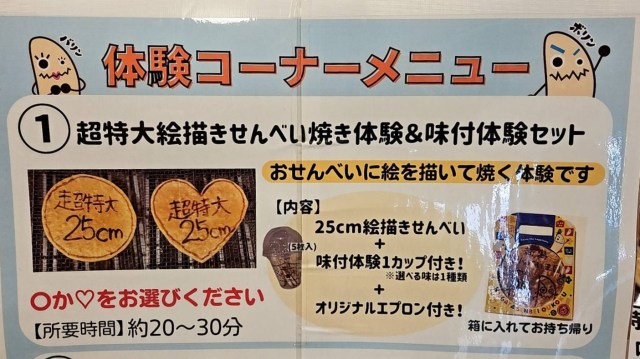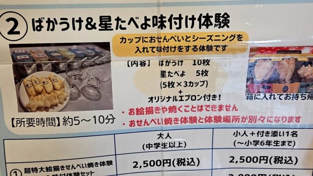この場所で「特大せんべい焼き体験(税込2500円)」&「ばかうけ&星たべよ 味付け体験(税込2000円)」ができるのだとか。