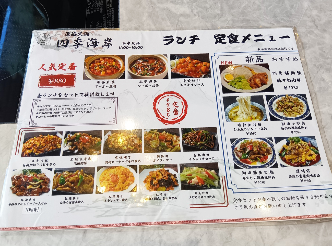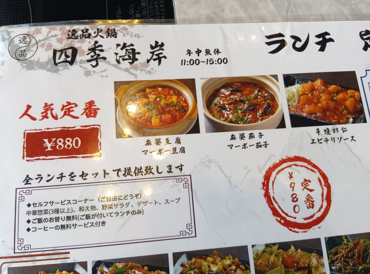 池袋中華街のガチ中華店のランチって、入ってみるとたまに看板より安いランチメニューが存在するパターンがあるけど、店内メニューを見たらここの最安は看板と同じようだ。麻婆豆腐880円が最安で、同じランクに麻婆茄子とエビチリソースがある。