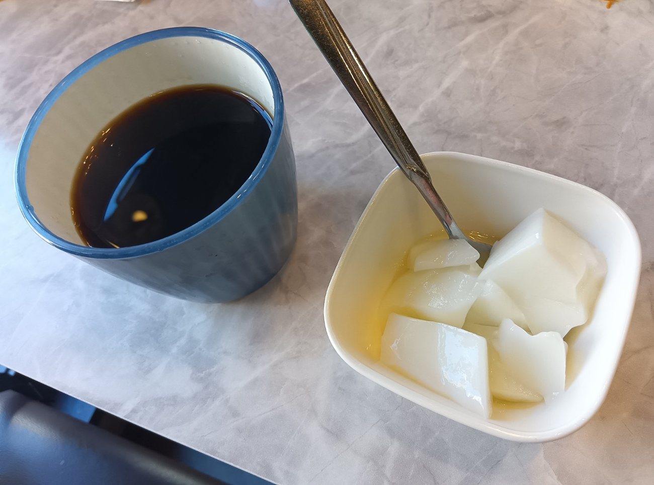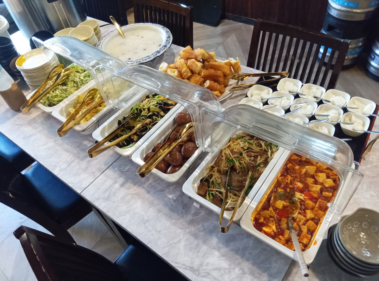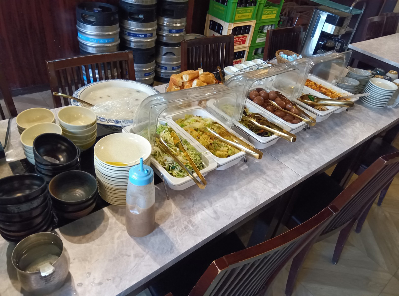 食べ放題コーナーはそんな麻婆豆腐含め、レバニラ炒め、味付け卵、サラダなど惣菜が6種類と、ご飯、スープ、杏仁豆腐、揚げパンがある。レバニラが副菜に入るのはちょっと珍しいのではないだろうか。食べ放題コーナー自体のラインナップは良い。