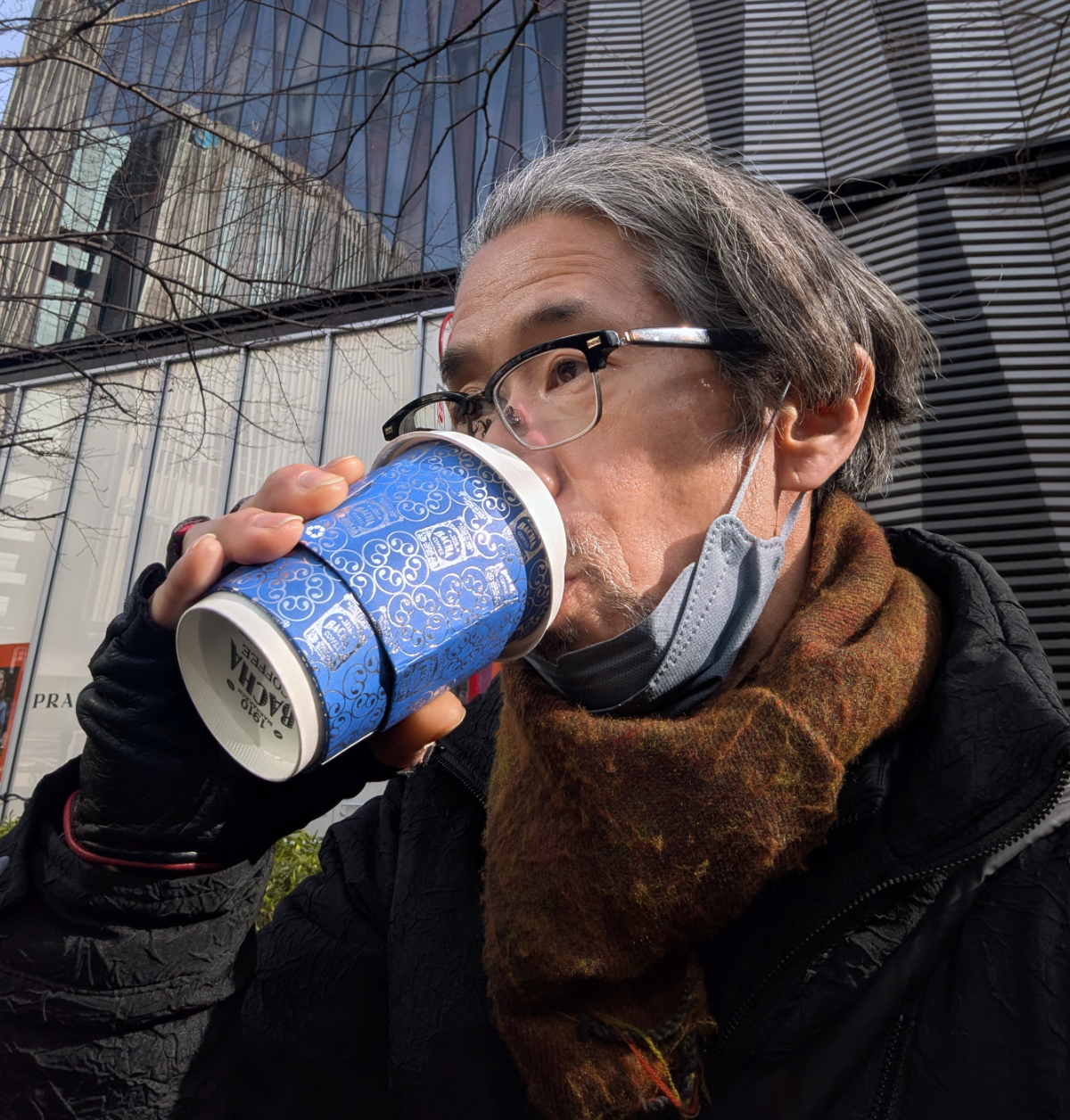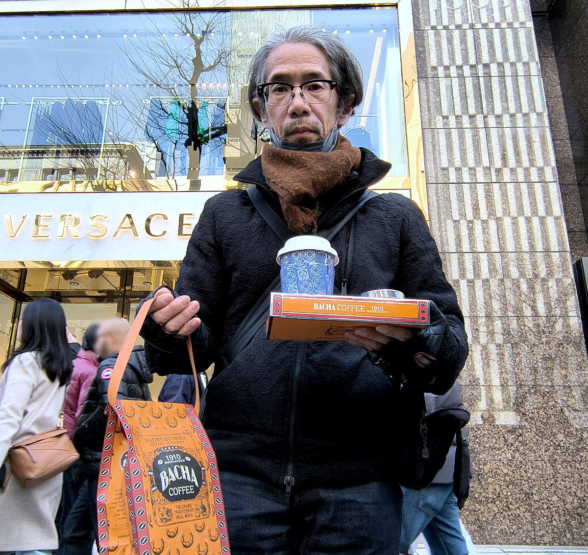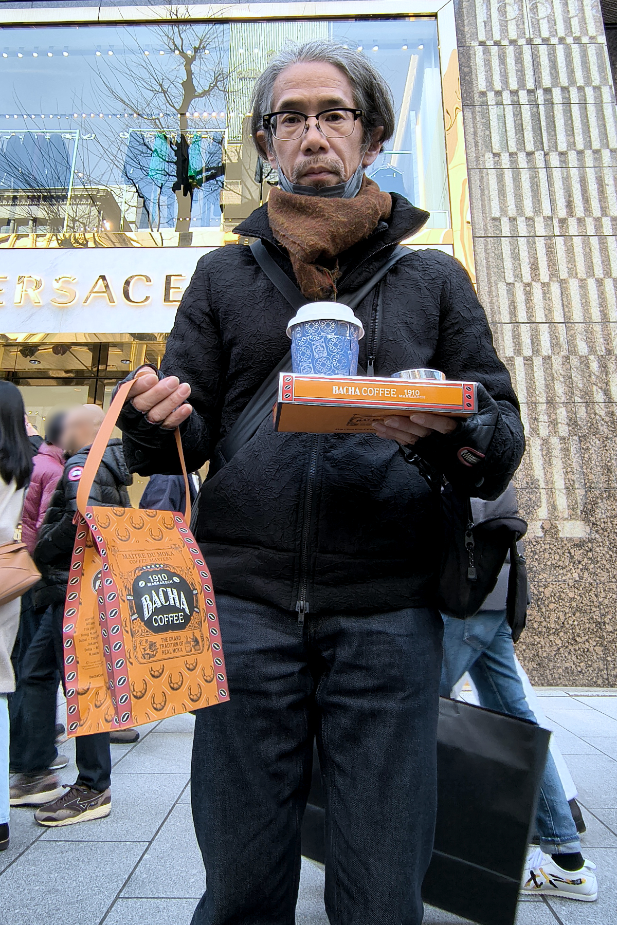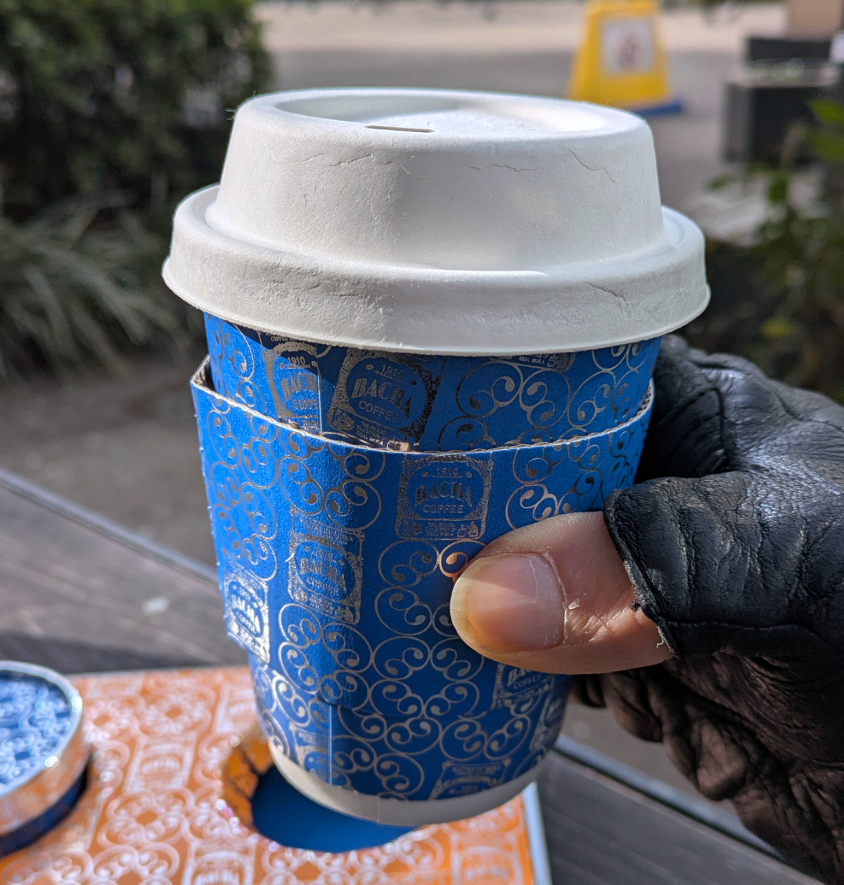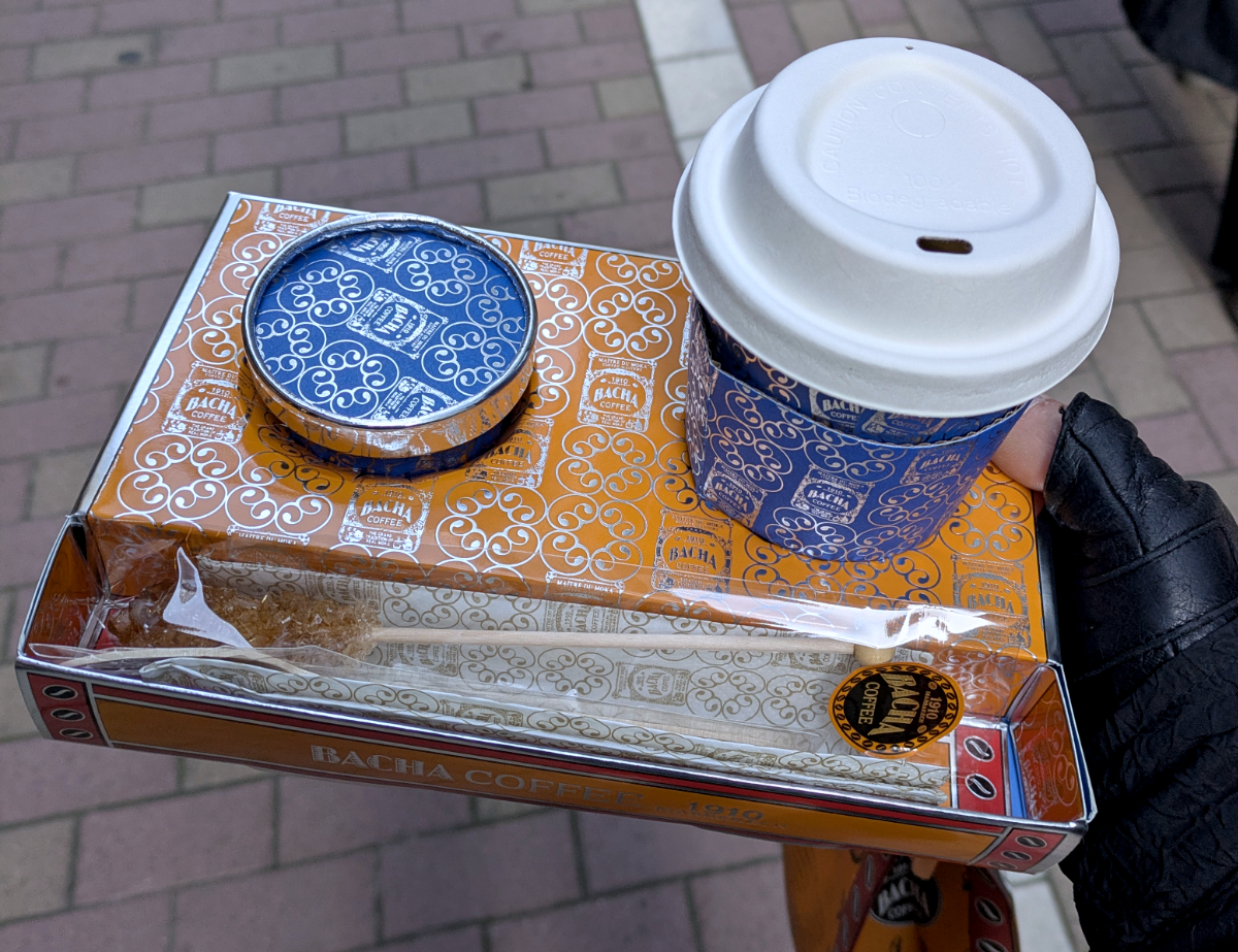 それで、まずは購入後の私の様子をお伝えすると、片手に購入品の紙袋、もう片手にコーヒーカップの乗った紙トレイを携えているのだ。これで外を歩くのは少々恥ずかしい。まるでコーヒーショップで商品購入後に席を求めてトレイを持ったまま店外に出てしまった人みたいじゃないか……