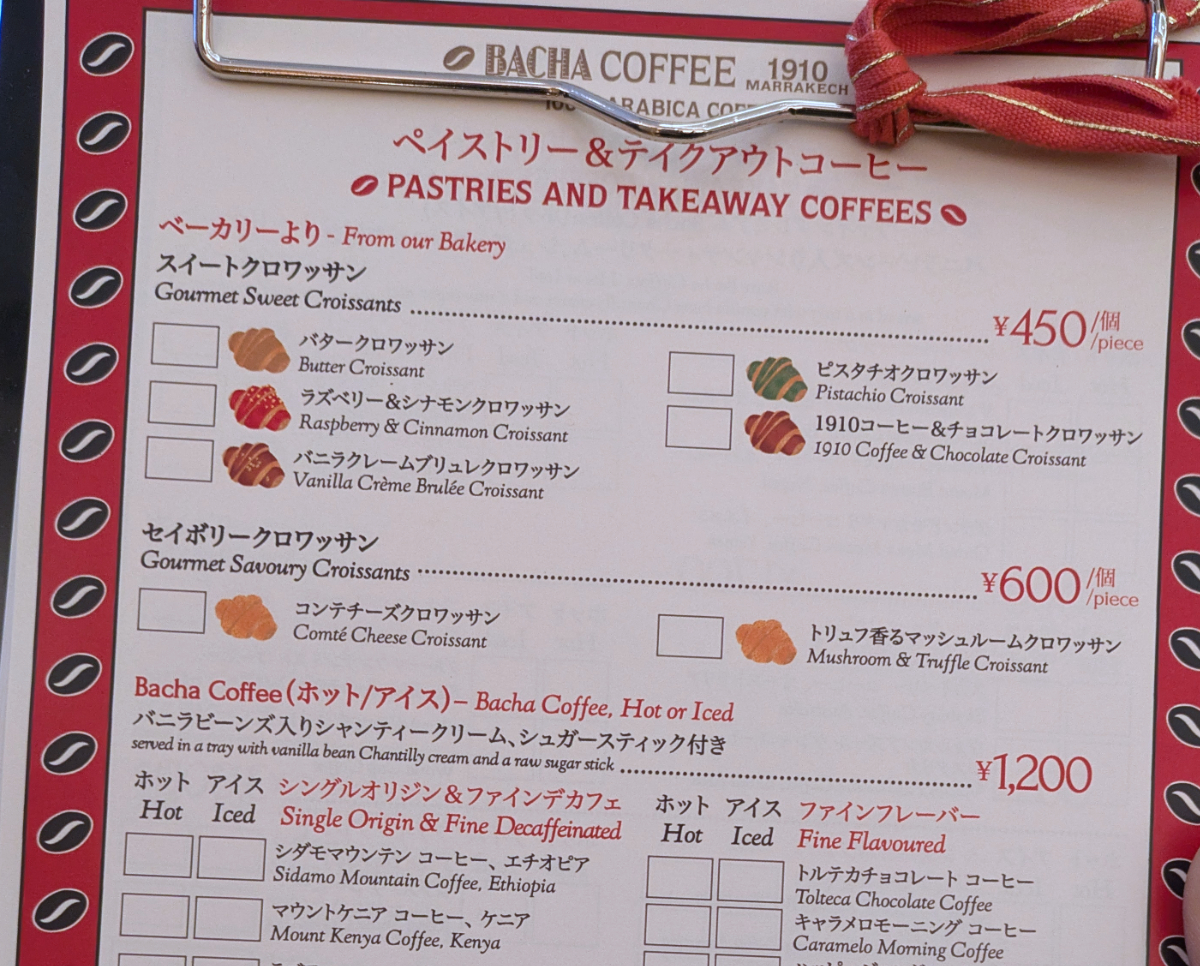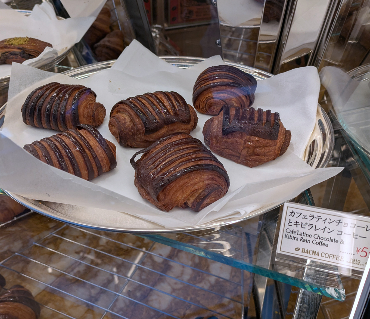 ならばと思い、テイクアウトすることに。コーヒーは1杯1200円だから、まあスタバを2杯飲んだつもりで頼むことにした。店頭のショーケースにはクロワッサンやケーキ類が並んでいて、それらも持ち帰ることができる。
