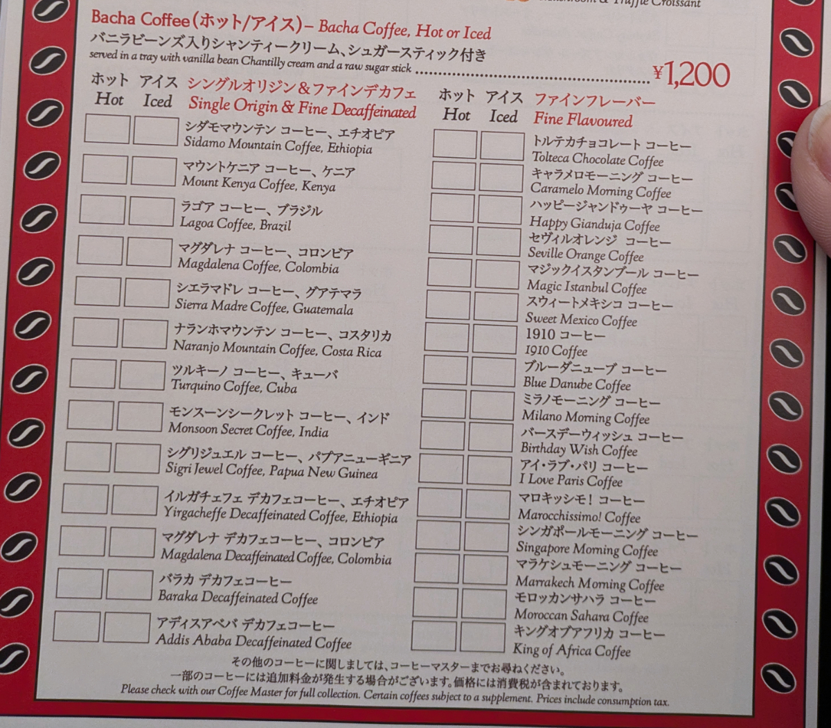 コーヒーは「シングルオリジン」「デカフェ」「ファインフレーバー」で全29種類もある。名前だけ見ても味の想像がつかないな。
