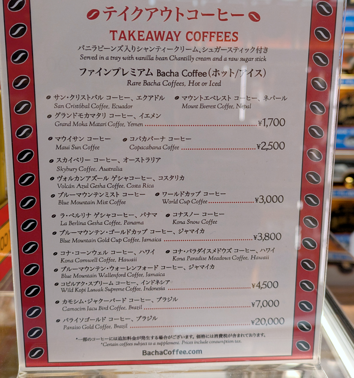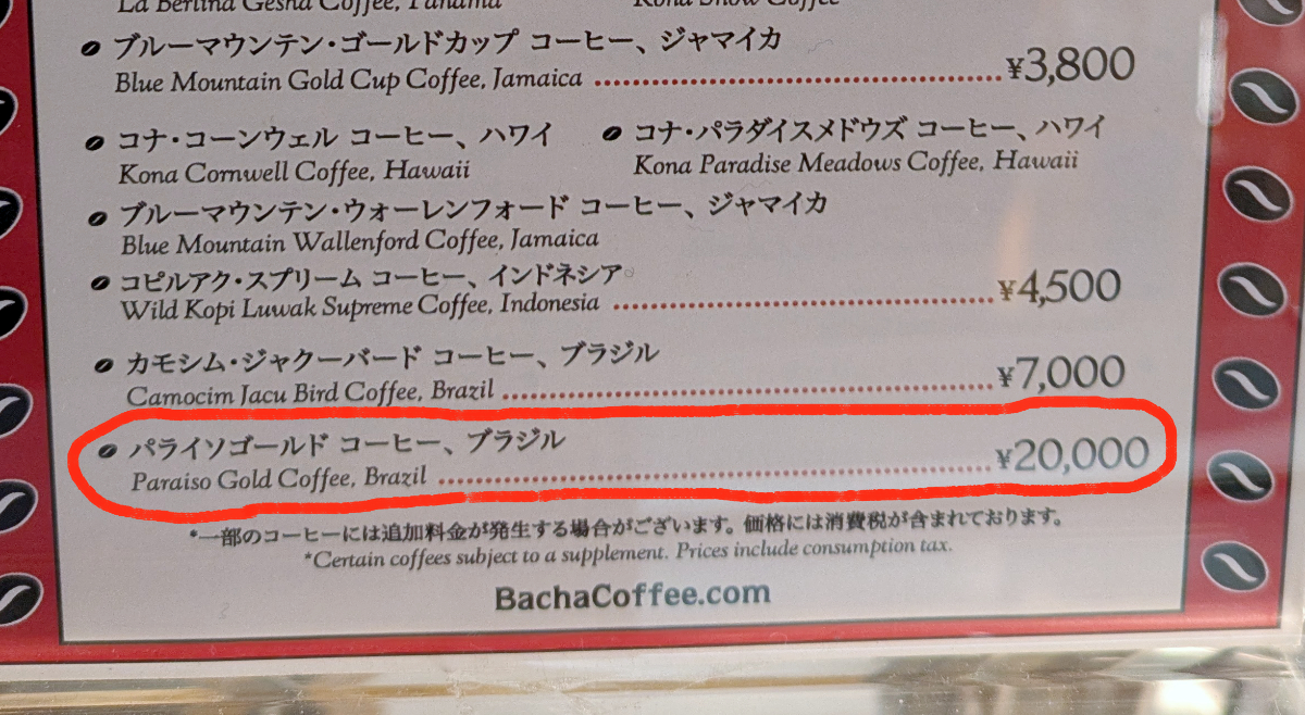 その最下段を見ると……、「パライソゴールド」は2万円! え!? 2万! テイクアウトのコーヒーで1万円札が2枚も必要ってマジかよ!