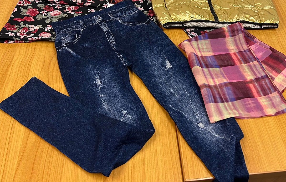 ▼佐藤が購入したものがこちら。やわらかデニム(レギンス?)が500円、柄物あったかインナーが1100円、ダウン(ベスト?)が500円、スカーフが480円で合計2580円