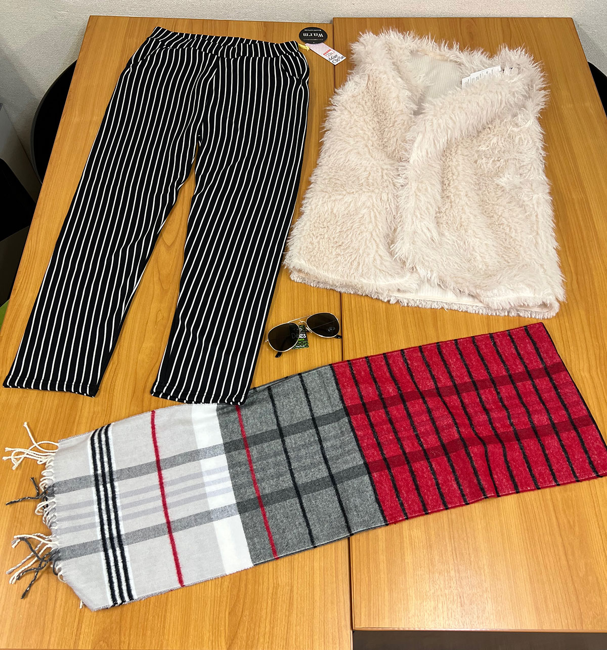 ▼私が購入したのはこちら。トップスが1980円、マフラーが800円、ボトムスが1000円、サングラスが1100円なので合計4880円。