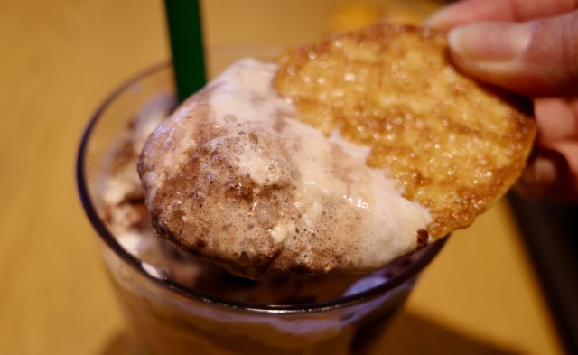 思わず食べ干してしまいそうになったが踏みとどまり、フラペチーノをすくって食べてみる。そうではないかと思っていたが、やはり素晴らしいマリアージュ。優しく甘いクッキーの旨味と、フラペチーノのほろ苦さの組み合わせは完璧だ。フラペチーノによりクッキーが少し、シナッとするところも良い。