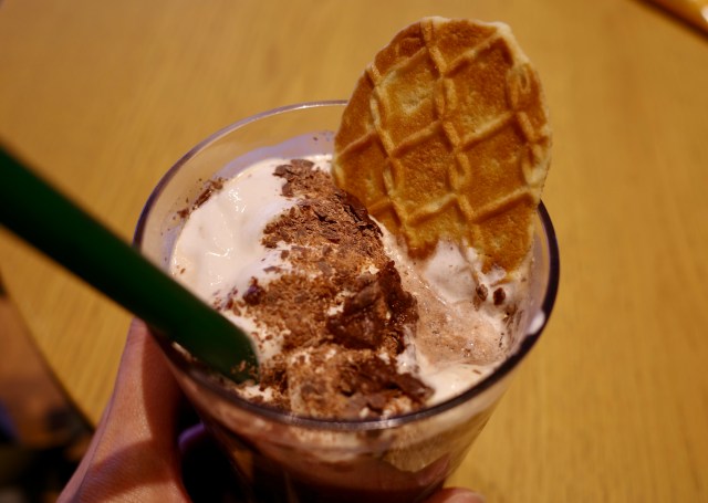 店員さんに伺っても、まずはこのままがオススメ、または「無料で追加できるチョコレートソーストッピングくらいでしょうか」とのこと。それならばと、心置きなくカスタムせず、そのままいただくことにする。