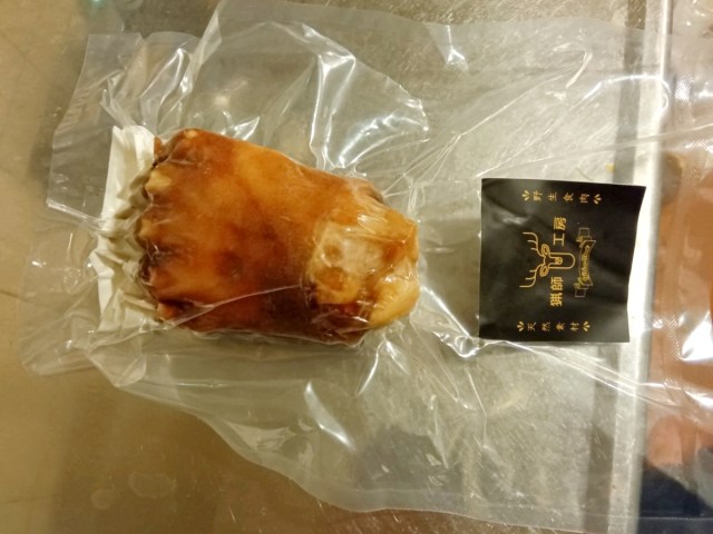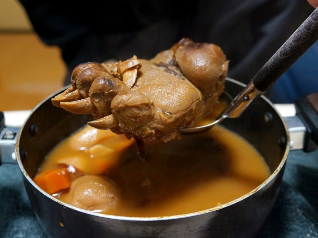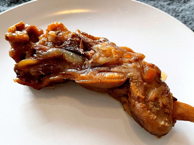つい先ほどまで “手そのもの” だったが、カットすることで肉料理っぽさが増す。雰囲気は豚足に近いかもしれない。それでは人生初の最高級ジビエをいただいてみましょうか。