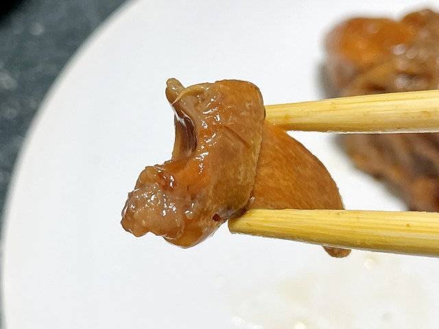 続いて私もガブリ。なるほど……まるでコラーゲンの塊のような食感で、かなりねっとりしている。そして同時に、なかなかの獣臭だ。