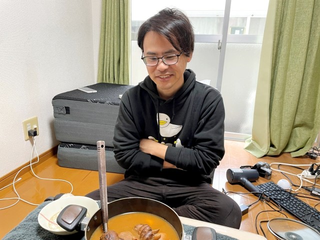部屋に入ってまず驚いたのが、物が全然ないこと。家具らしい家具がほぼ見当たらないのである。ふと床を見ると……。