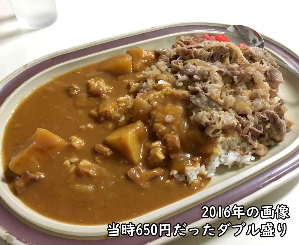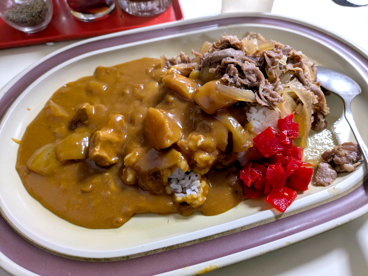 やっぱり名物の「牛丼 & カレー ダブル盛り合わせ」なんだよなあ。どうしても、コレを食いたくなってしまう。