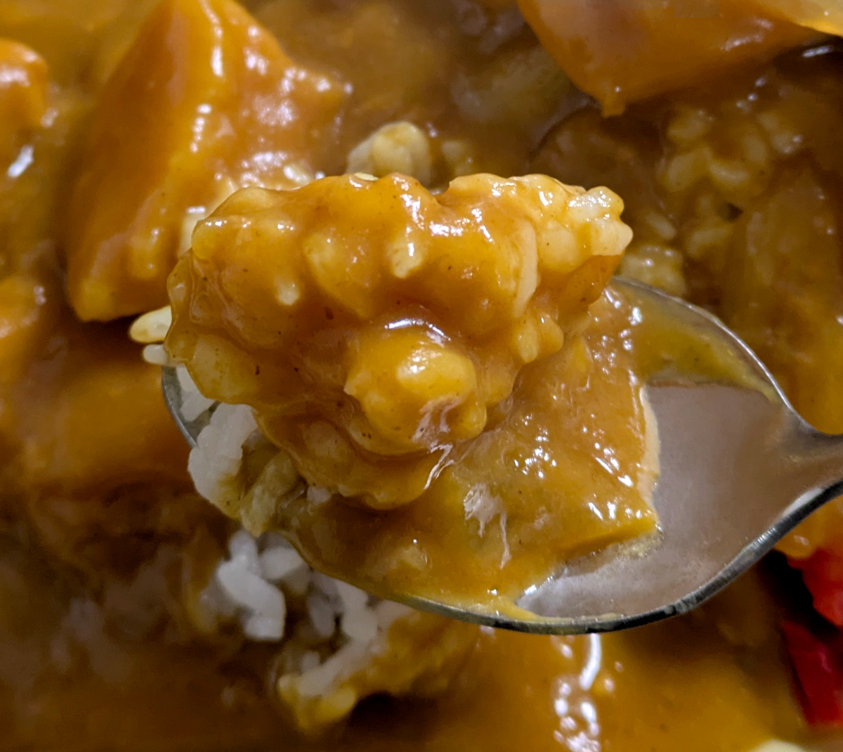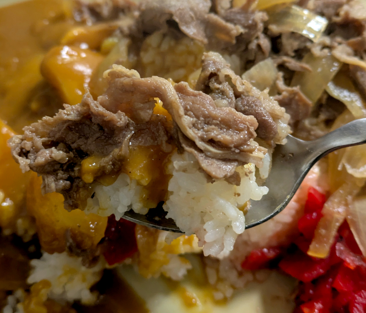 カレーはじゃがいもがゴロゴロ入った、昭和を感じる懐かしいスタイル。脳裏には学校給食が思い浮かぶ。そのまま食ってもいいし、ちょっとワイルドにソースをドバドバかけちゃってもいいヤツだ。