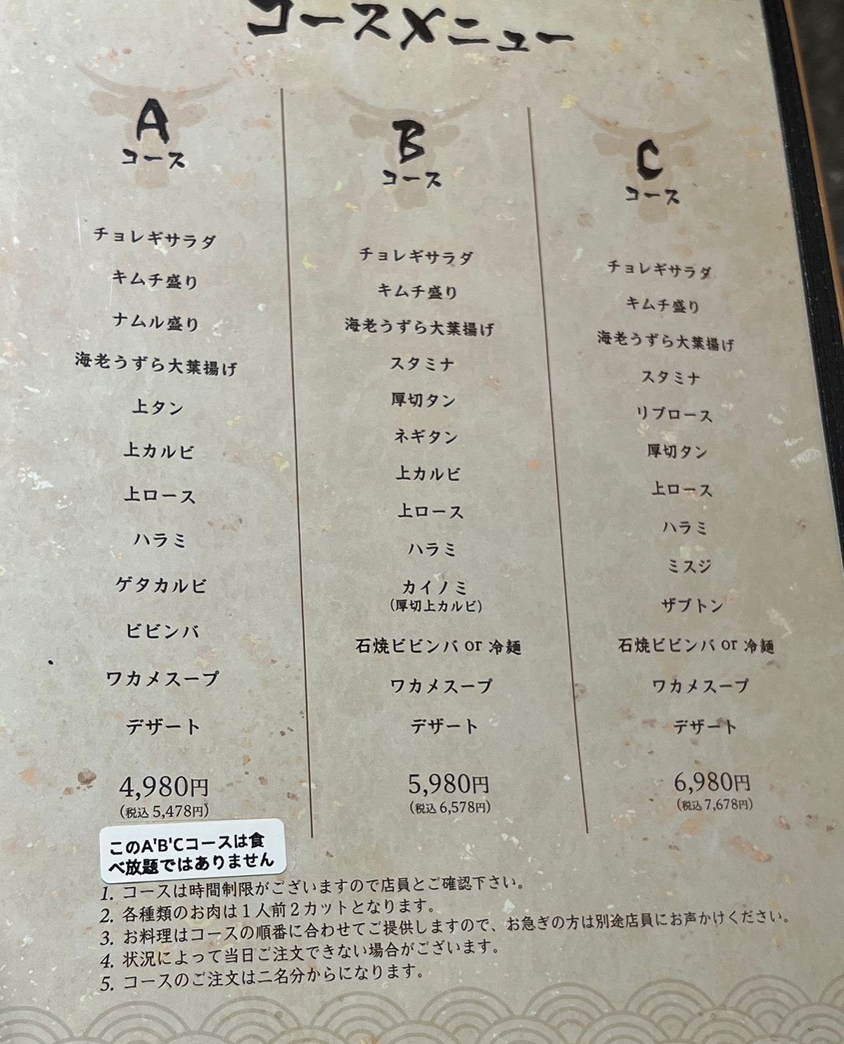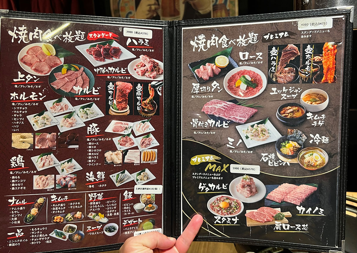 ▼焼肉食べ放題のスタンダードコース(4378円 / 左ページ)とプレミアムコース(5478円 / 右ページ)。プレミアムコースには、スタンダードコースのメニューが含まれる