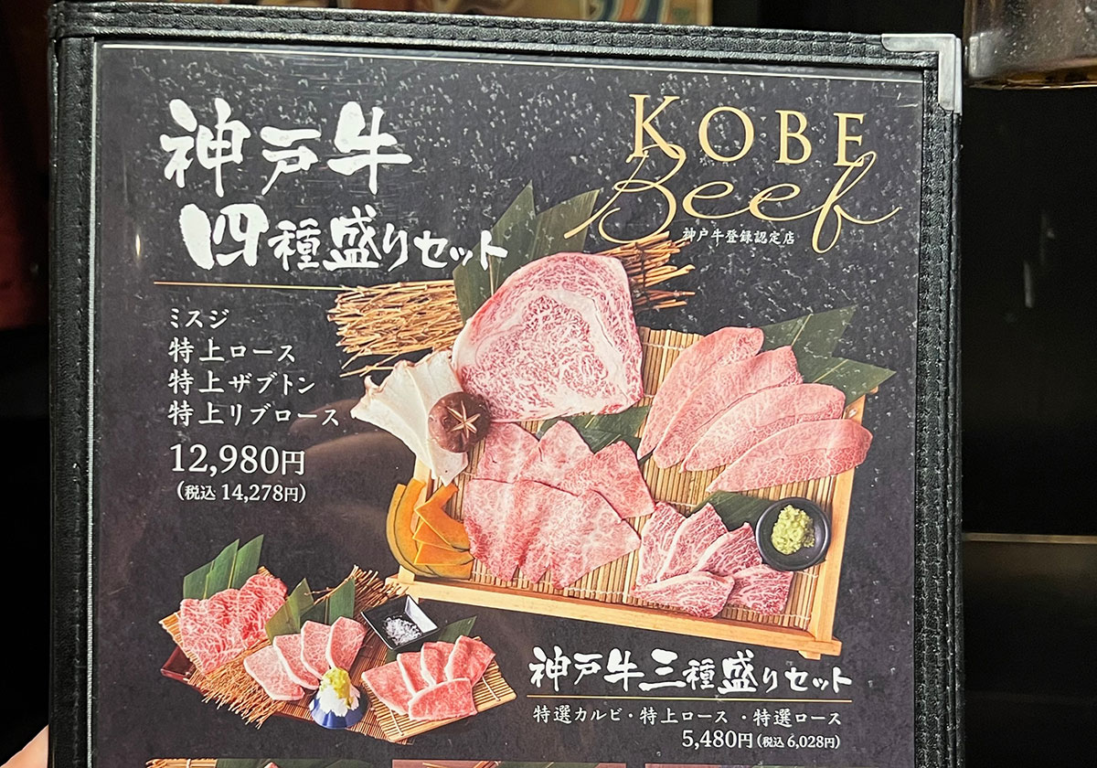 神戸牛があるじゃないか。4種盛りセットで1万4278円!! 食べ放題(スタンダード)が4378円だから、1皿で食べ放題より高い。
