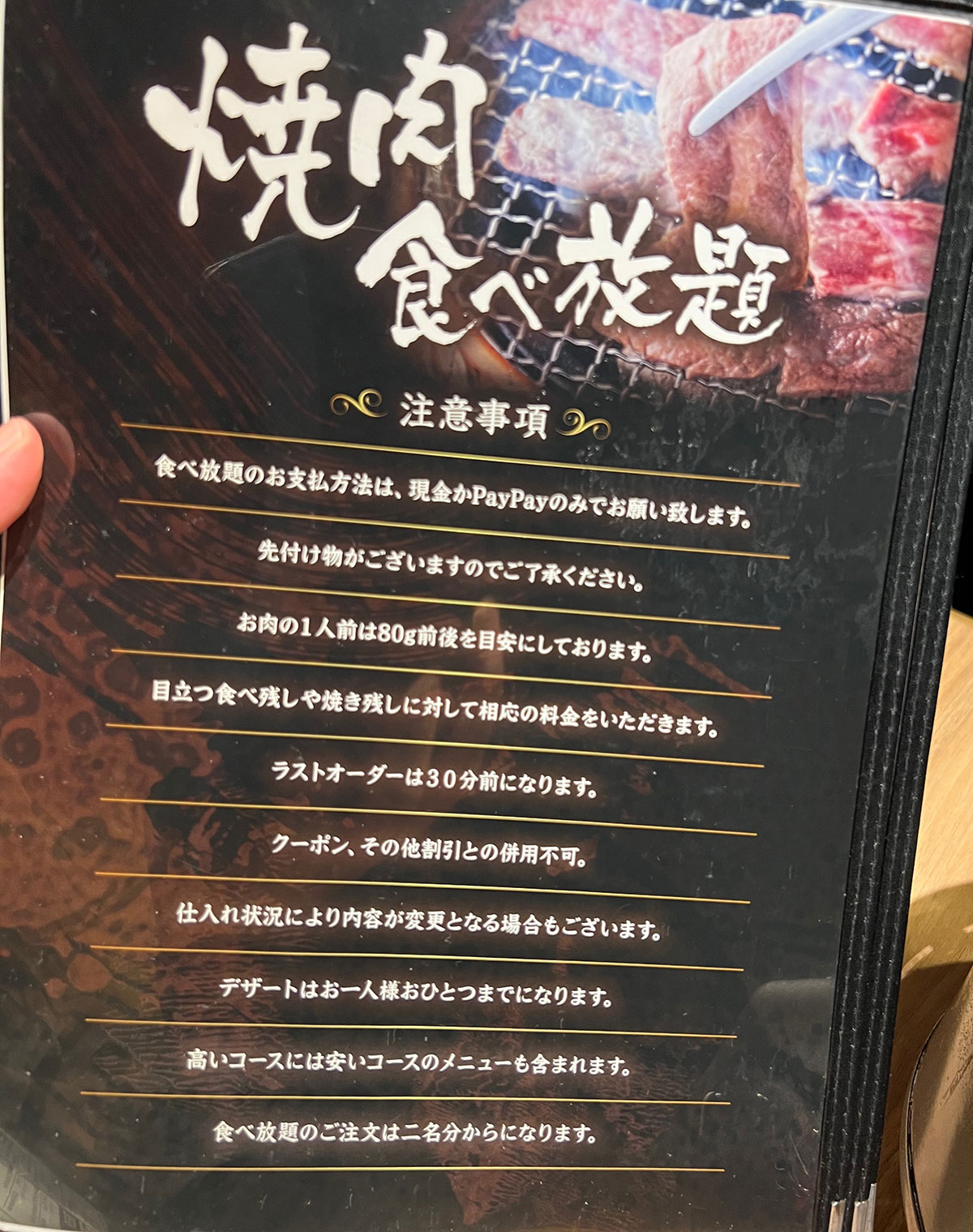 店の前に出ている看板に書かれていることといったら、食べ放題の対象メニューの一部と制限時間、価格くらいだったりする。スペースの問題上食べ放題の細かいルールまでは書き切れないから、仕方ないのだ。
