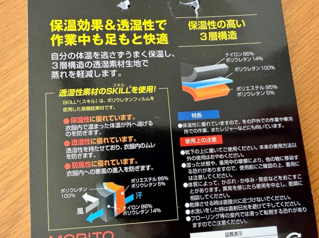 それはさておき、パッケージや情報を整理すると、このインナーソックスには「SKILL(スキル)」なるワークマン独自の透湿素材が使われているそうだ。ポリウレタンフィルムを使った高機能素材で、保温性・透湿性・防風性に優れているという。