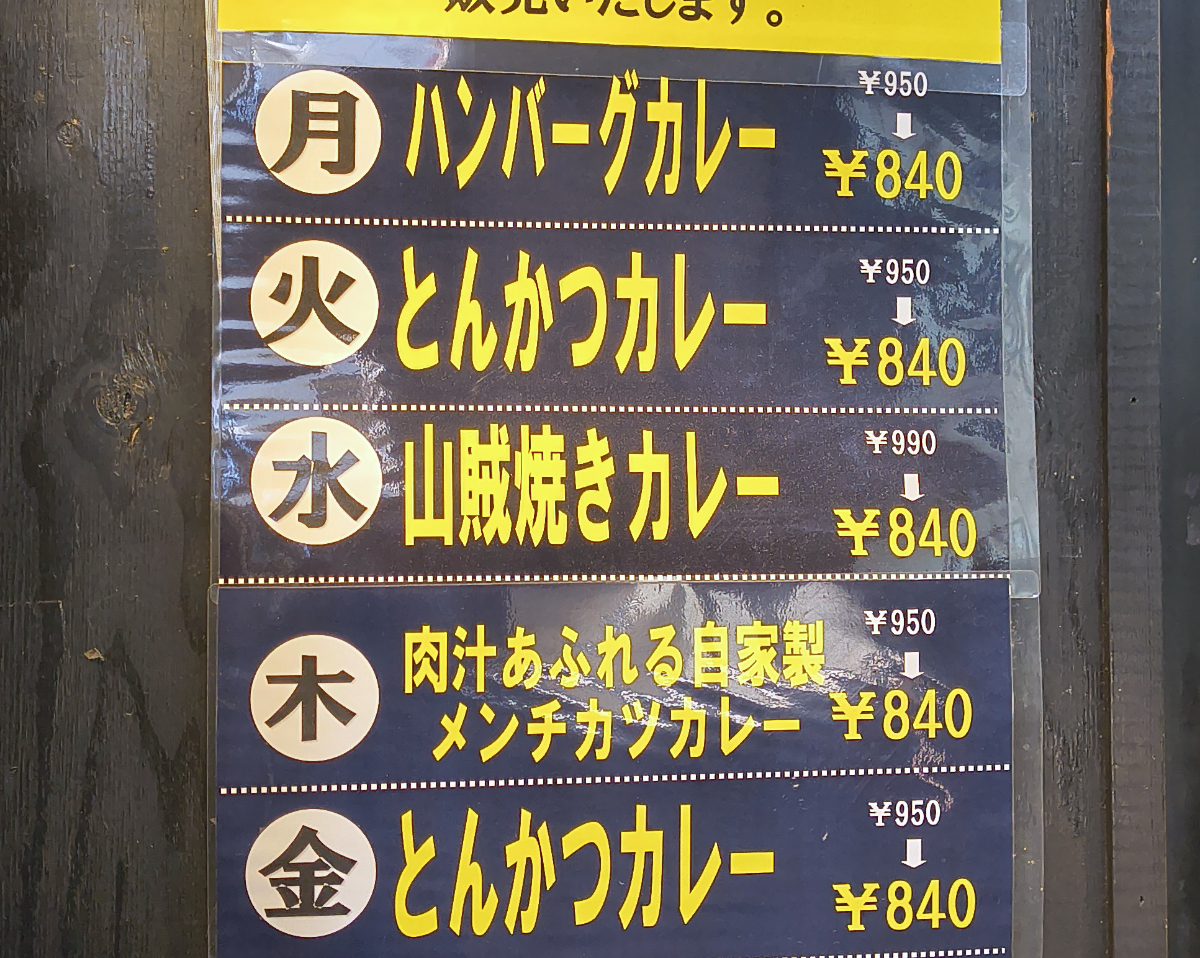 ……と思ったら、入口の横に日替わりの割引価格が記載されていた。それによると、ハンバーグカレーもとんかつカレーも山賊焼きカレーも全部840円になってる! 毎日割引ってマジかよ!!